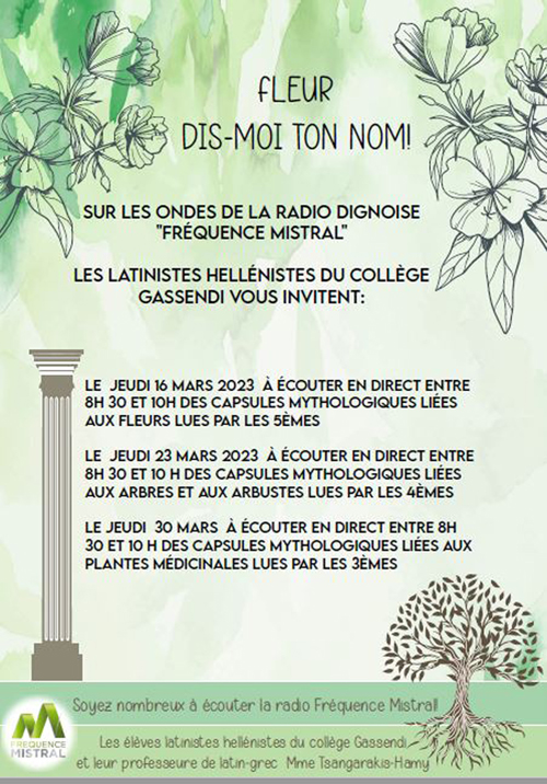 Le prochain et dernier rendez-vous à Fréquence Mistral se fera avec les élèves latinistes-hellénistes de 3ème du Collège Gassendi, le jeudi 30mars 2023 à partir de 8h30 sur les plantes médicinales.