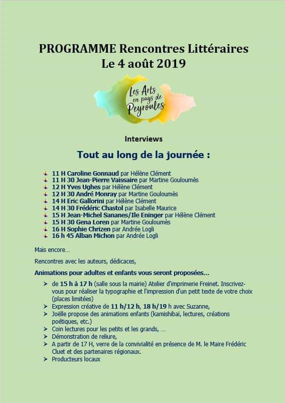 L’association « les Arts en pays de Peyroules » reprend cette année l’organisation de la troisième édition des « Rencontres littéraires du Teillon », qui se tiendront le dimanche 4 août. Tout au long de la journée une quarantaine d’auteurs seront présents, pour des interviews des débats, des rencontres. Seront proposées également des animations destinées aux adultes et aux enfants, des producteurs locaux présenteront des produits du terroir et à partir de 17h un verre de la convivialité sera offert en présence des partenaires régionaux et de Frédéric Cluet, le maire de Peyroules. Pour retrouver le détail de la programmation : la page Facebook les Arts en pays de Peyroules. Deux organisatrices de ces rencontres littéraires, Marie-Thérèse Farré et Joëlle Bourrud, détaillent cette journée au micro d’Olivier Mouly.