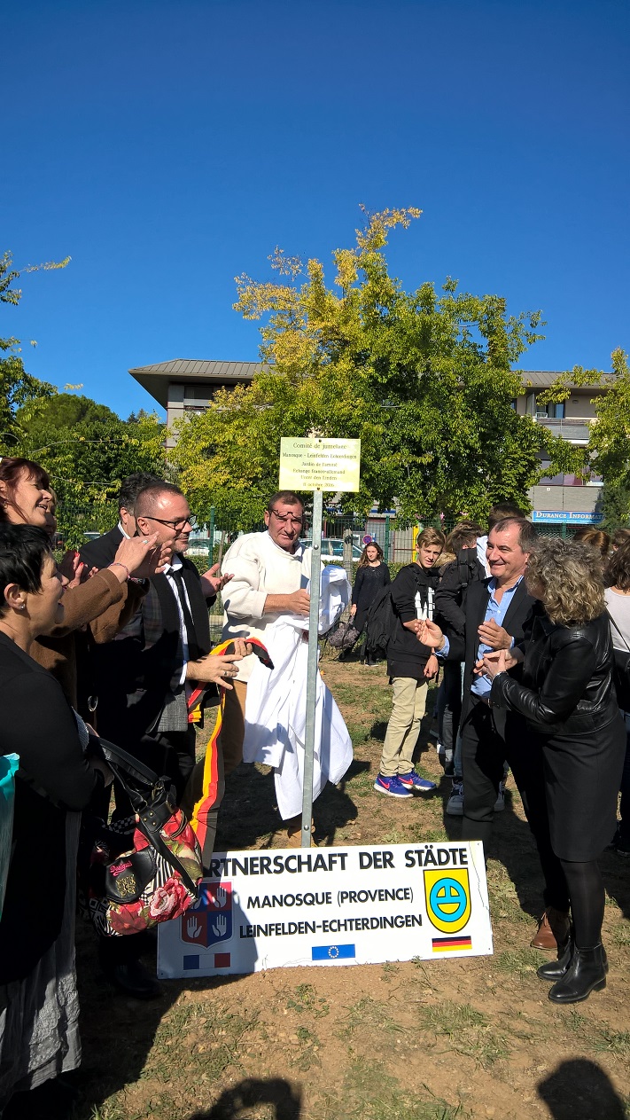 Depuis 1971, collégiens et lycées français et allemands découvrent et apprennent une langue étrangère autrement. Loin des cours parfois ennuyeux où les acquis ne sont pas toujours mis en application, le jumelage entre Leinfelden–Echterdingen et Manosque leur permet de rencontrer des jeunes de leur âge et de pratiquer dans un contexte d’échange réel l’allemand pour les uns, le français pour les autres. L’entente franco-allemande illustre la construction culturelle européenne et la nécessité pour les peuples de mieux se connaître pour éviter de nouveaux conflits mondiaux. Et afin de laisser une trace et un beau symbole pour ce 45ème anniversaire, le comité de jumelage et le lycée des Iscles ont décidé de planter un tilleul dans l’enceinte de l’établissement en écho aux arbres de la paix de la Révolution française. La Ville de Manosque, l’Inspection académique, les enseignants et les élèves du lycée des Iscles et de l’école de la Ponsonne, aux côtés de leurs correspondants allemands se sont réunis pour ce moment symbolique. Alexia Baron a rencontré Sabine Copeland, professeur d’allemand et présidente du comité de jumelage Manosque-Leinfelden-Echterdingen pour discuter de l’importance de ces échanges dans la construction de l’identité européenne. Mais d’abord, les élèves de CM1 de l’école de la Ponsonne interprétent un chant… en allemand.
