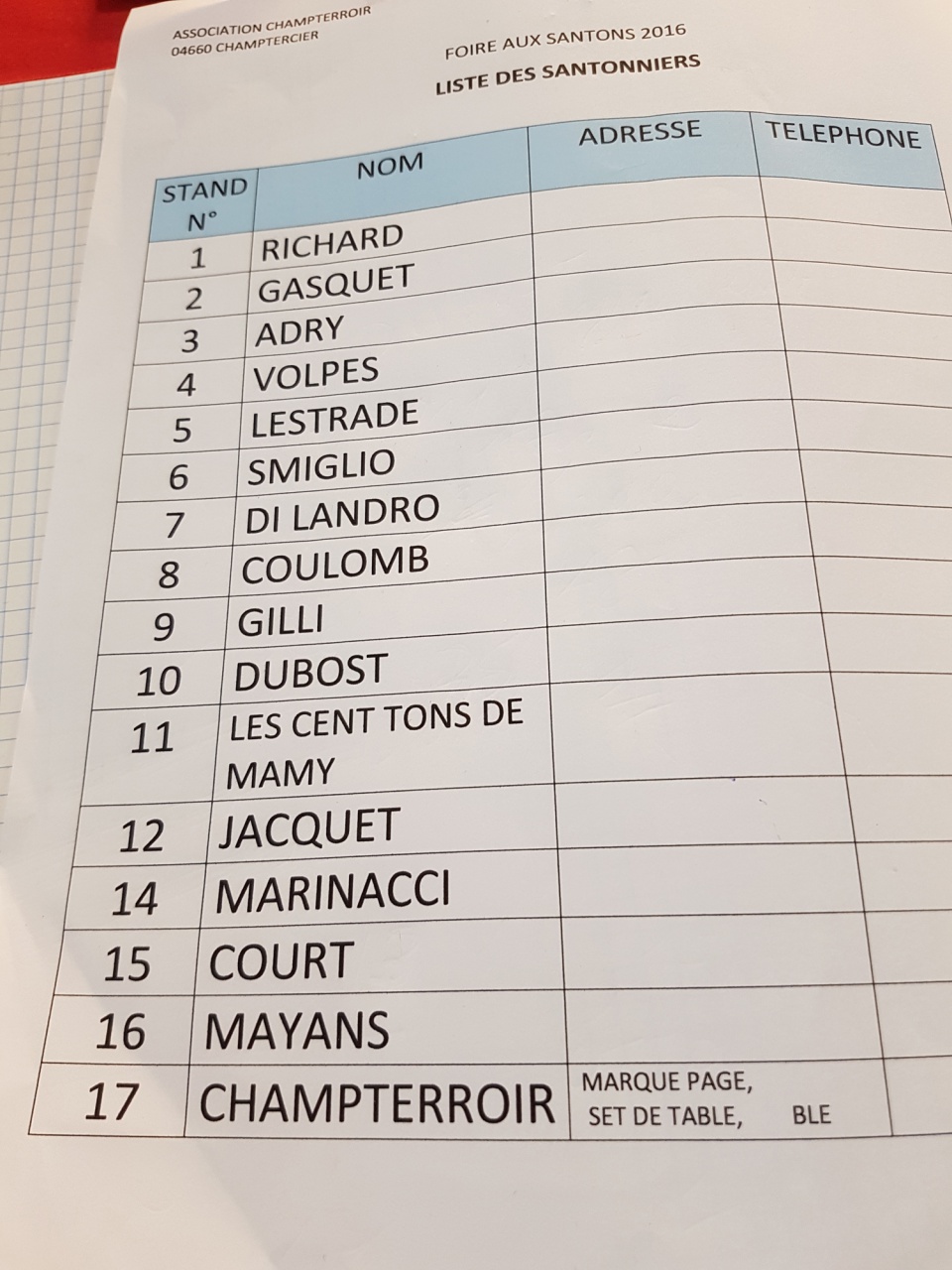 Des figurines représentant des santons sont installées tout au long de la route de Champtercier, avec 2 nouvelles figurines représentant un ramasseur de genêt, et une ramasseuse de lavande, placées de chaque côté de la salle polyvalente, où le public pourra découvrir les santons de la 34ème foire aux santons organisée par l’association Champterroir. Parmi les nouveautés également, une banderole de 5 mètres sur 1 mètre représentant le village de Champtercier, photographié par un photographe d’Aix puis peint par Gérard Bois de Digne. Les amateurs de santons sont invités à se rendre cette semaine de 13h30 à 18h30 et le week-end du 3 et 4 décembre, de 10h à 18h30 sans interruption à la salle polyvalente pour découvrir l’exposition de santons issue du travail de 15 santonniers exposants. Sans oublier le concert à l’église avec La chorale Canto Verdoun dont la participation est libre au bénéfice de l’association Pas à pas pour Annaëlle, pour une aide au financement d’un fauteuil électrique pour la petite fille. Je vous propose d’écouter le Président de l’association Champterroir Rénald Sulpice. Reportage Odile Frison.