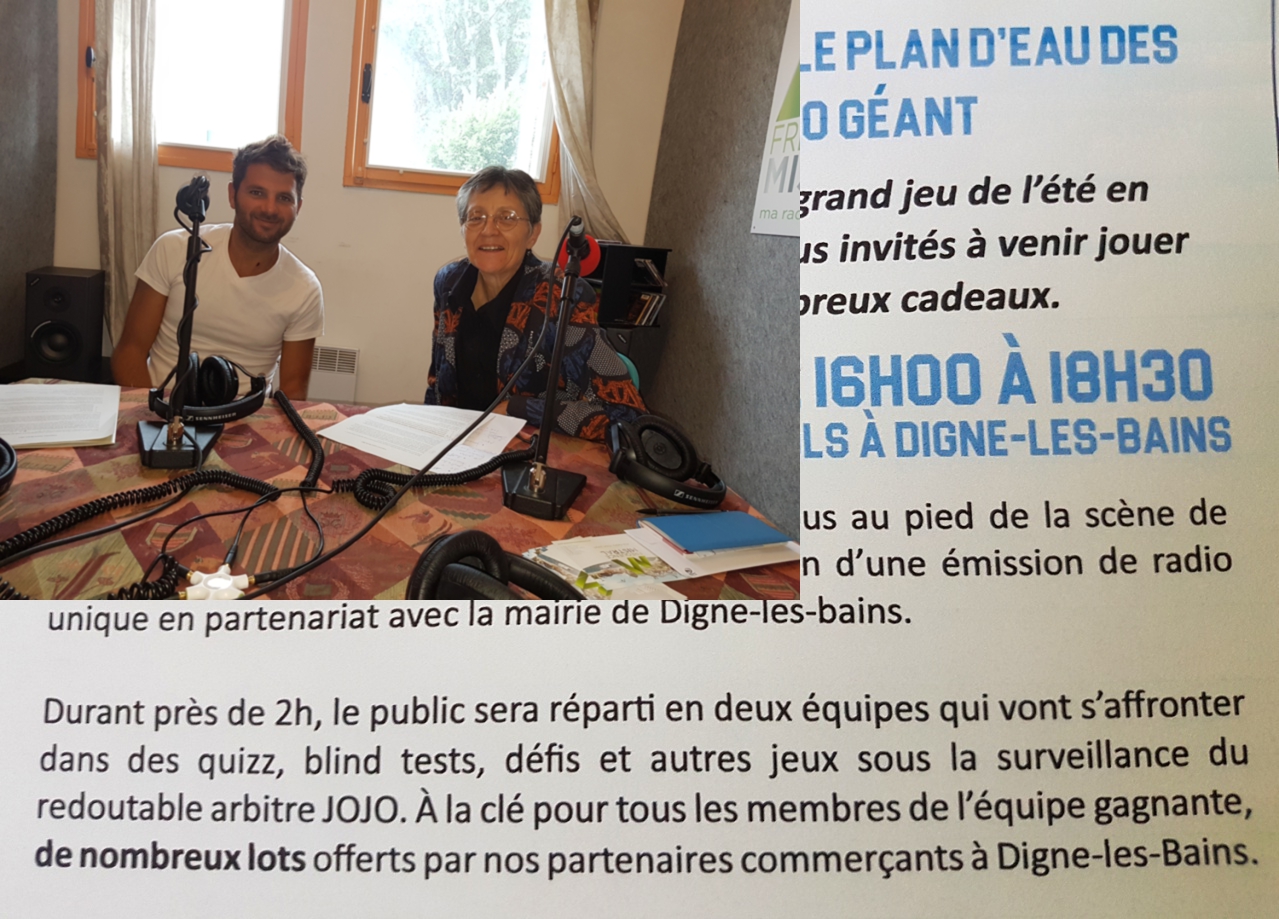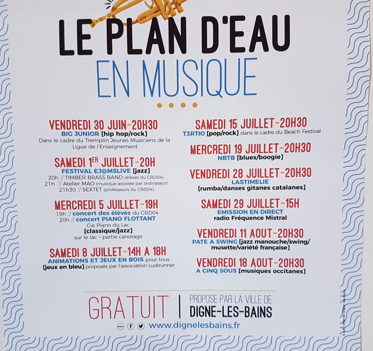 Le plan d’eau des Ferréols attire de plus en plus de monde pour la beauté du site mais aussi pour les animations qui y sont proposées depuis 2014. Elles sont toutes gratuites et proposées par la ville de Digne-les-Bains. Le public pourra donc assister à des concerts de pop-rock, jazz manouche ou encore du swing ou du classique, mais aussi jouer avec Ludirunner le 8 juillet. A noter aussi le retour de la belle équipe de Mixtral, nos jeunes animateurs dignois. Dimitri Capel et ses amis sont bien rodés puisque ce sera la deuxième aventure d’émission en direct diffusée sur tout notre réseau. Je vous propose d’écouter au micro d’Odile Frison, Céline Oggero-Bakri adjointe déléguée à l’attractivité de la ville de Digne-les-Bains.