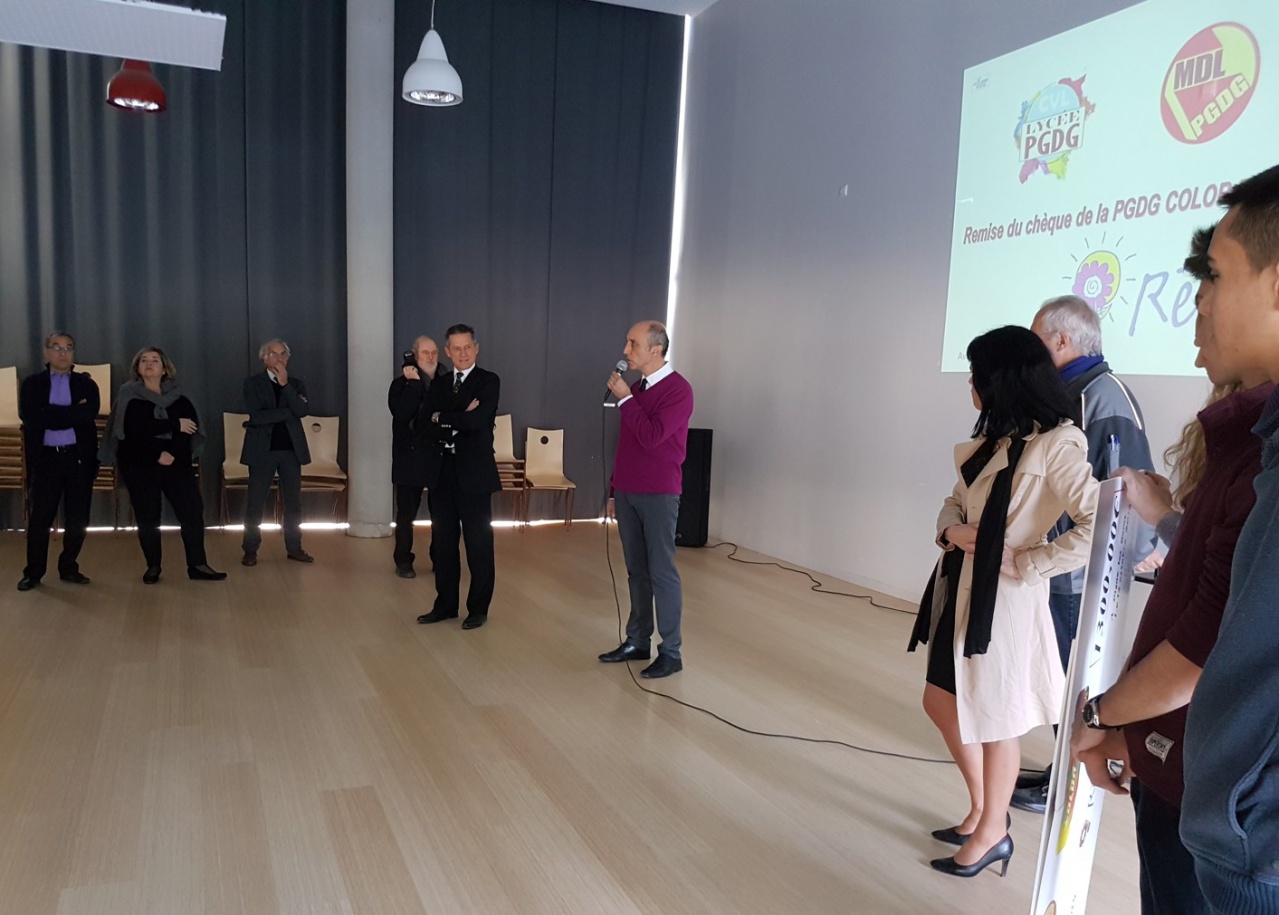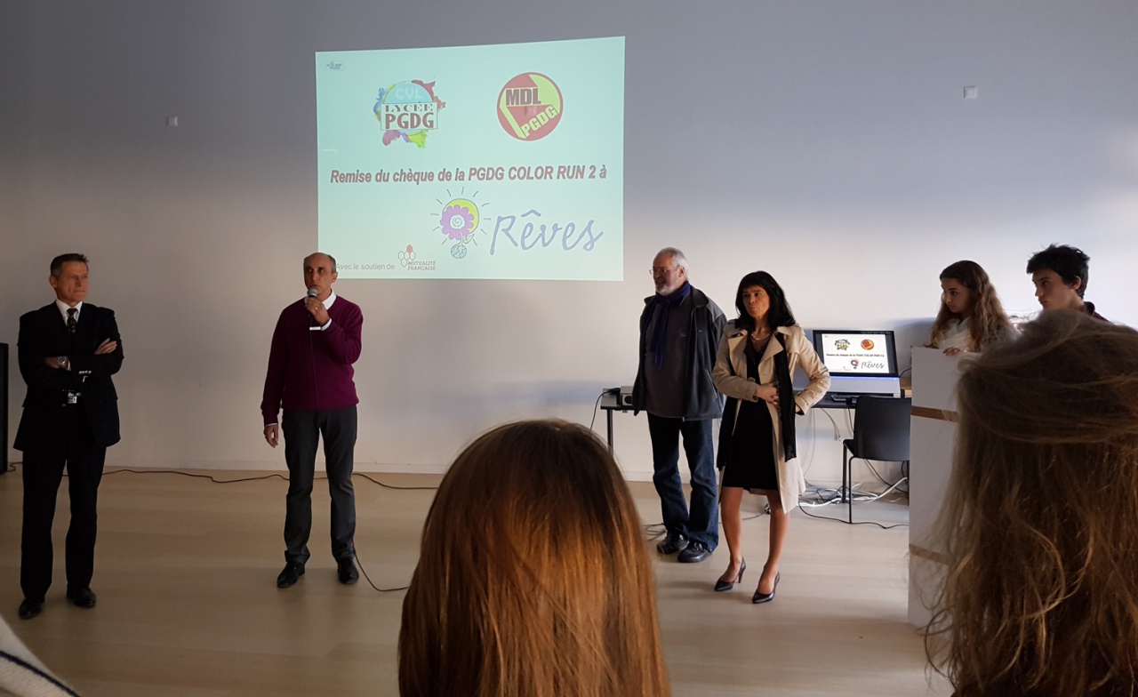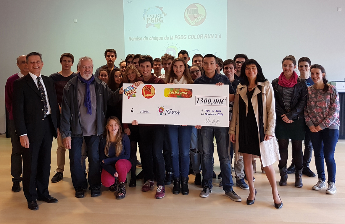 Les élèves du Lycée Pierre Gilles de Gennes participent à la réalisation de rêves d’enfants gravement malades. 1300 €, c’est la somme collectée grâce à la course color run de 470 lycéens le 12 octobre dernier. Devant l’inspecteur d’académie Éric Lavis, le proviseur de l’établissent Jean-François Lecomte et son adjoint Mathieu Zaroukian, et également Stéphane Viudes pour la vie scolaire du lycée mais aussi Sophie Balasse Présidente de l’association Rêves, les élèves ont remis les fonds récoltés à l’association. Une somme qui permettra à des enfants atteints de maladie grave de pouvoir réaliser un de leurs rêves. L’association a été créée il y a 4 ans dans le département des Alpes de Haute-Provence, et existe au niveau national depuis 1994. Reconnue œuvre de bienfaisance, l’association exauce depuis 22 ans le rêve des enfants et d’adolescents touchés par une maladie grave. En concrétisant leurs souhaits, ces enfants peuvent ainsi s’évader de la maladie et de l’hôpital qu’ils côtoient régulièrement et l’action les aide à reprendre espoir et croire en l’avenir. En 22 ans, plus de 3300 rêves se sont réalisés dans toute la France, grâce à un réseau de 700 bénévoles répartis sur 37 Délégations départementales. Sur le 04, elle a déjà permis à une quinzaine d’enfants de vivre un moment fort à travers un rêve réalisé. Dans ce reportage d’Odile Frison, je vous propose d’écouter tout d’abord le proviseur du lycée Pierre Gilles de Gennes Jean-François Lecomte, puis le témoignage de Lucille, élue au conseil de vie lycéenne, et enfin Sophie Balasse qui préside l’association Rêves. Jean-François Lecomte.