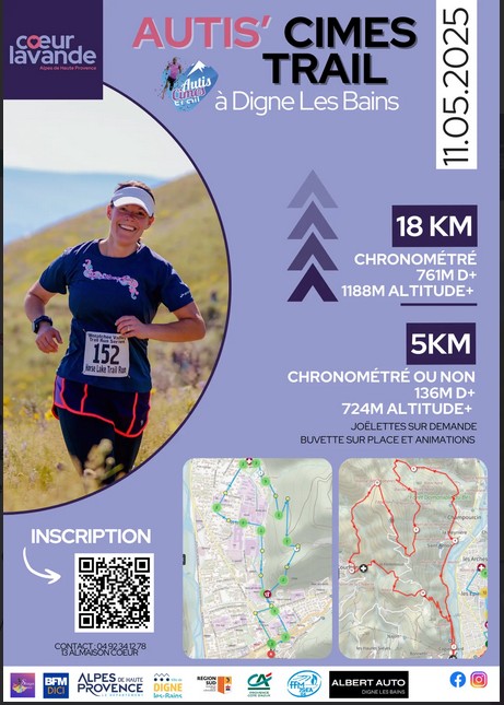 L'Autis'Cimes Trail, c'est un événement sportif et solidaire organisé par Cœur Lavande . Au programme : un trail de 18 km chronométré et une course/marche de 7 km, accessible à tous, y compris aux familles et aux personnes handicapées.