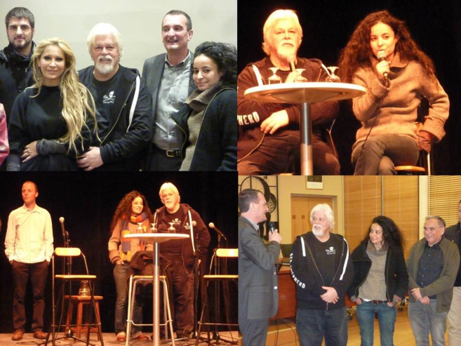 Le point de départ de l’activisme de Paul Watson débute à l’âge de 12 ans, il sera ensuite le plus jeune co-fondateur de l’ONG Greenpeace qu’il quittera en 1977 pour créer son propre mouvement Sea Shepherd (Berger de la Mer). L’ONG fonctionne avec des dizaines de milliers de bénévoles et seulement 25 salariés dans le monde entier. Son financement est assuré à 100% par les dons et les frais de fonctionnement ne s’élèvent qu’à 3%. Sea Shepherd lutte pour la protection des océans et contre les dégâts engendrés par l’homme. 1100 personnes, toutes générations confondues sont venues s’informer à Draguignan sur la situation du milieu marin. Quelques chiffres alarmants : Au cours du XXème siècle, 90% du peuple marin a été éradiqué et depuis 1950, 40% du phytoplancton a disparu. 40% des poissons vendus sur le marché, y compris dans les grandes surfaces, sont pêchés illégalement. Les pratiques intensives consistent à utiliser des filets de 100 km et des satellites pour repérer des bancs de poissons et continuer à chasser les 10% de poissons restants. 100 milliards de subventions mondiales à l’année sont octroyés pour la pêche industrielle et pratiquement aucune sanction dissuasive n’est pratiquée contre la pêche illégale. 45% des poissons pêchés sont destinés à l’alimentation des fermes et des chats domestiques etc. Et ce dans un total déni de la COP21 qui n’a pris aucune mesure pour les océans. Un enregistrement de la conférence et une version complète du reportage de Véronique Hermant, sont disponibles sur notre site Castellanais. Je vous propose d’écouter le capitaine Paul Watson et Lamya Essemlali, présidente de Sea Shepherd France et traductrice de Paul Watson qui évoque l’origine de son engagement au sein de l’ONG. Lamya Essemlali