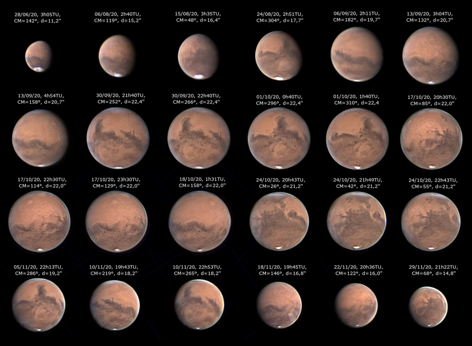 En 2020 les conditions d’observation de la planète Mars ont apporté d’immenses satisfactions aux astronomes amateurs : la planète, assez haute dans le ciel, a présenté un diamètre apparent confortable, la météorologie terrestre automnale a été dans l’ensemble très favorable en octobre et novembre. Philippe Filliatre a regroupé sur cette planche ses images de 2020, montrant à l’échelle l’évolution du diamètre apparent et du paysage dévoilé par la planète rouge.