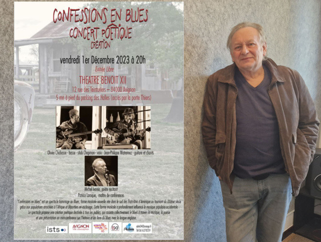 Confessions en Blues est un concert poétique hommage au Blues, créé en résidence par Michel Ivonio aux textes, poète récitant, et Olivier Chabasse à la basse électrique, au Stick Chapman et voix, et Jean-Philippe Watremez à la guitare et chant.