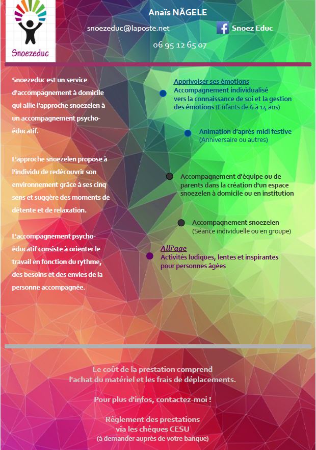 Découvrez en quoi consiste Snoez'éduc, mot issu des compétences d'Anaïs en tant qu'éducatrice spécialisée, et de la méthode Snoezelen. Je vous propose d'aller à la rencontre de cette toute jeune fille, passionnée par son métier et domiciliée à Digne-les-Bains. Elle était l'invitée d'Odile Frison dans l'émission "Quartier Libre" ce vendredi 24 août 2018 à 17h