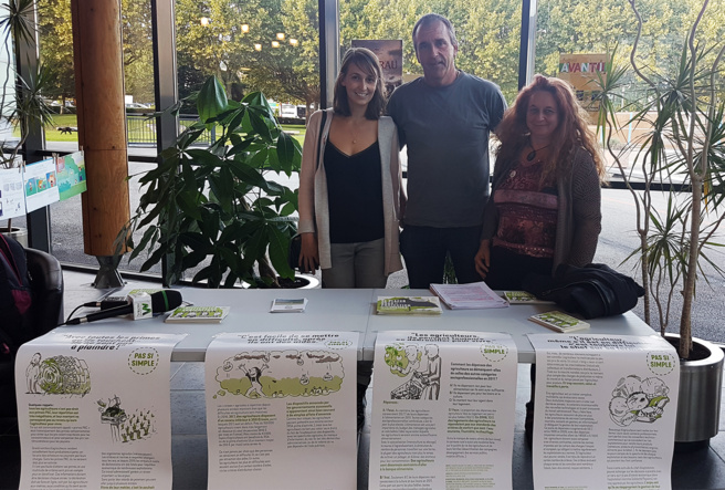 En région Sud environ 350 familles sont accompagnées chaque année. Fanny Fontaine est l’une des 6 salariés de Solidarité Paysans Paca, elle a animé le débat accompagnée de 2 membres bénévoles, dont Yves Combes et Sandrine Pilati ancienne éleveuse et productrice de fromage de chèvre. Si cette dernière témoigne d’une reconversion réussie, lors du débat, l’émotion est toujours vive. Fanny Fontaine, Yves Combes, et Sandrine Pilati sont au micro d’Odile Frison.