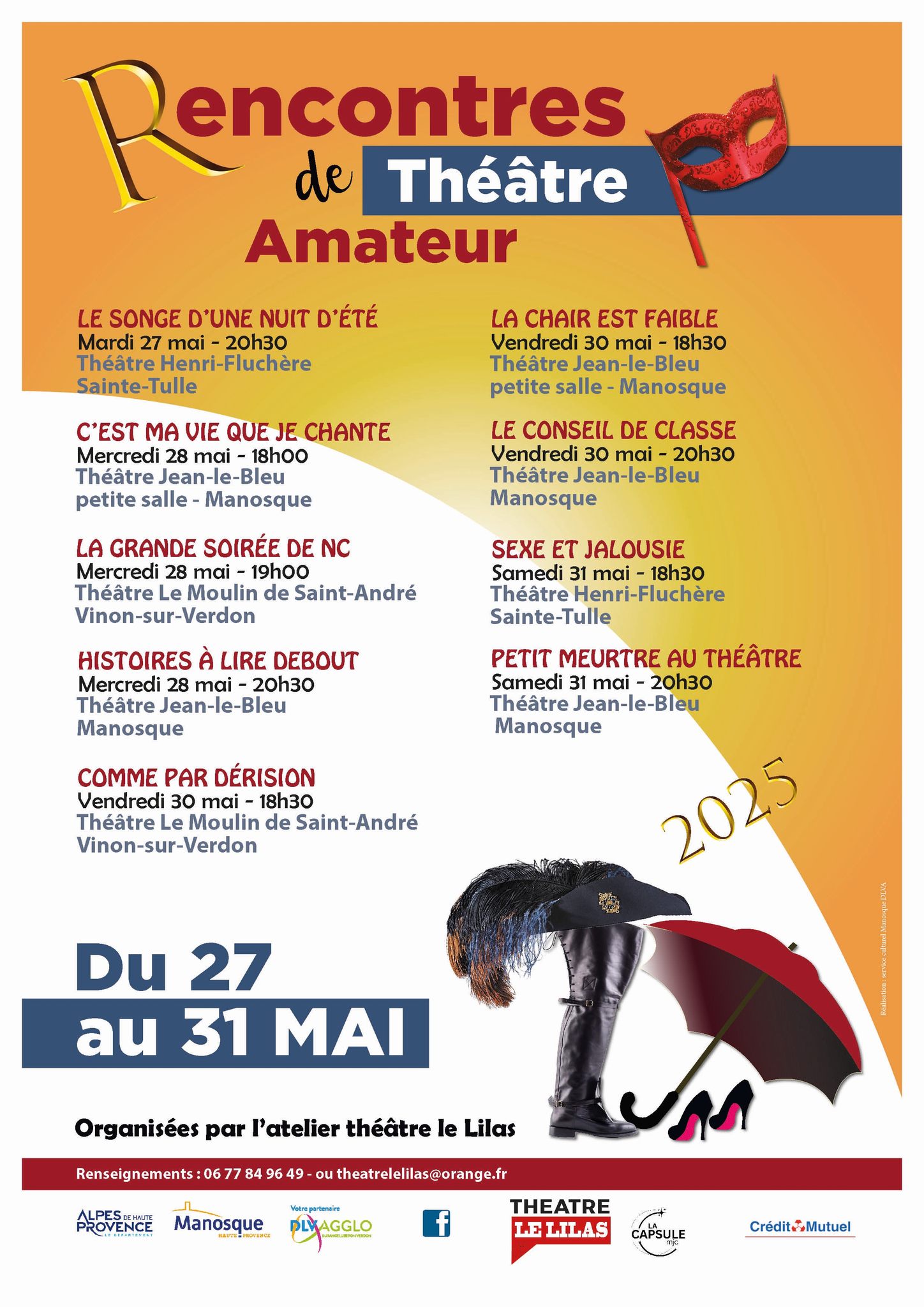 Organisées par l'association Théâtre Le Lilas, les 19èmes rencontres de théâtre amateur se tiendront du 27 au 31 mai à Manosque, Sainte-Tulle et Vinon-sur-Verdon.