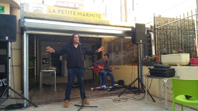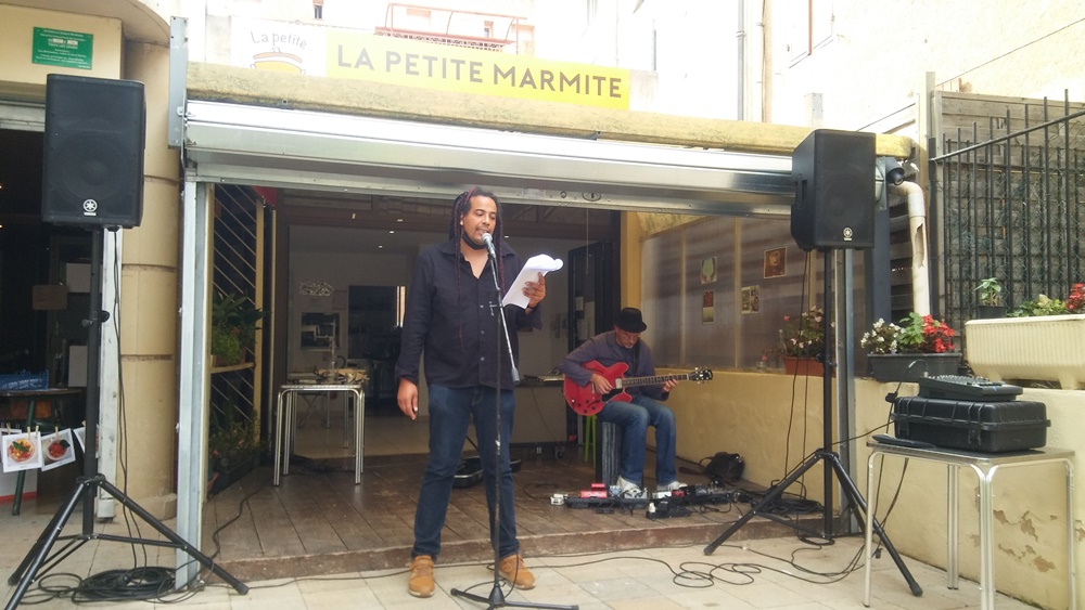 Présent lors des Correspondances de Manosque pour une lecture et brillamment accompagné par le guitariste Nicolas Repac, Julien Delmaire a fait une halte remarquée à la petite marmite, cantine participative de la cité de Giono. Il a aussi gratifié les spectateurs de quelques-uns de ses superbes poèmes.