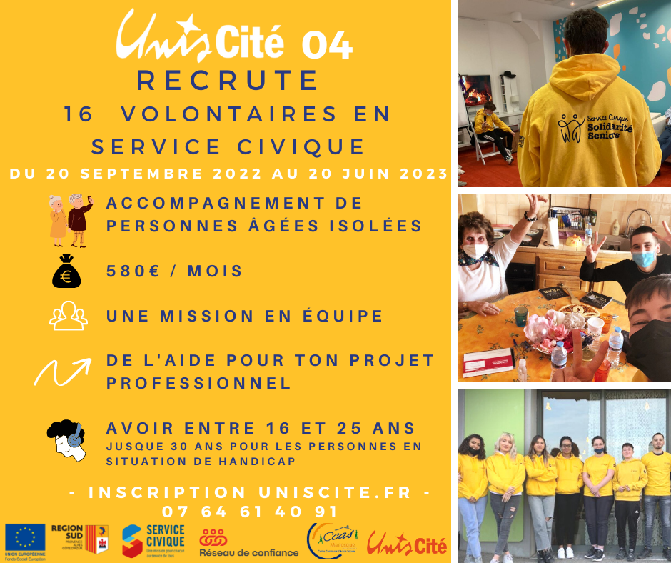 L’association Unis Cité 04 recrute 16 volontaires de 16 à 25 ans en service civique pour accompagner des personnes âgés isolées de septembre 2022 à juin 2023. C’est une mission en équipe avec un suivi régulier par un tuteur et une indemnité de 580 euros par mois.