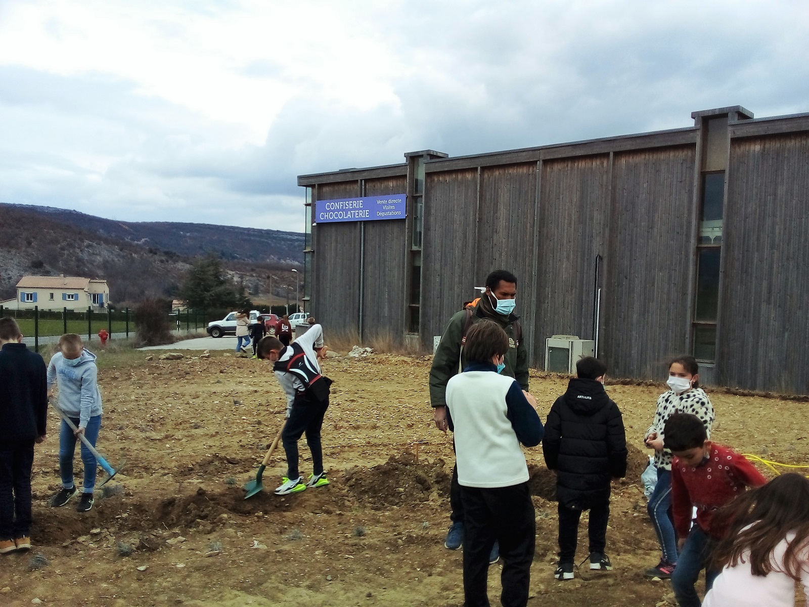 C’est dans ce cadre que le vendredi 19 mars des élèves de l’école de Banon ont planté plusieurs pistachiers, tout proche de leur village, à la Confiserie-Chocolaterie Leblanc.