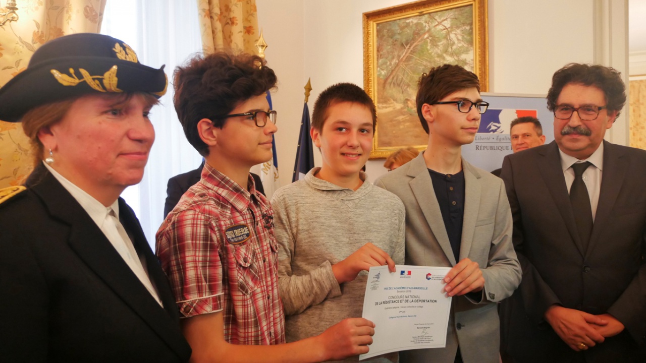 Travaux collectifs Lycée : 1er prix Antoine BEAUDOUIN, Sacha BECOURT, Anna BELIGNI, Samantha BRESSY, LIona CESARINI, Justine DERCOURT, Oualid GASMAOUI, Florian RUIZ (Lycée des métiers A. Beau de Rochas, Digne-les-Bains), 2ème prix Déborah DUCHAUSSOY, Marion DEPEYRE, Elodie BRIOLA, Emma CARNAROGLIO (Lycée polyvalent Paul Arène – Sisteron), 3e prix ex-aequo Noémie CHOLET, Lilou CARION (Lycée polyvalent Paul Arène – Sisteron) et Marie WAECKERLE, Eva GILLAIN (Lycée polyvalent Paul Arène – Sisteron). Travaux collectifs Collège : 1er prix Laura CANDAELE, Romain DARDANELLI, Mikaël RANQUE, Elise SENES (Collège du Pays de Banon), 2e prix Alexandre TRENOVITC-RAVAUTE, Charles LE RIGUIER, Johan GOUTORBE (Collège du Pays de Banon), 3e prix Emerick GAY, Morgiane KHELFALLAH, Octave NICOLLE, Sarah LUCAS, Julien MARCHIO, Ilian GARIN, Mattéo MARTIN, Djenette REKIA, Charlène CREMADES, Anaïs LE GALL, Sarah MUSSET, Alexia RICCA, Mathias RONZONI, Juliette VEREECKE (Collège Le Sacré Cœur, Digne-les-Bains).
