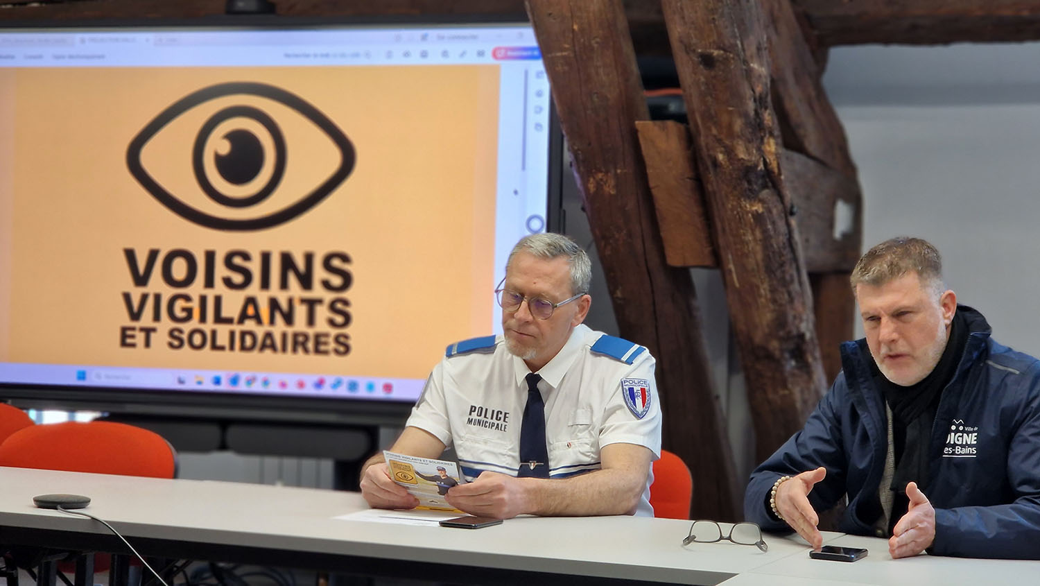 Une conférence de presse en présence d'Alain Scipion Chef de la police municipale de la ville de Digne les Bains et de Bernard Pieri maire adjoint sécurité, tranquillité publique de Digne les Bains a été donnée mercredi 12 mars 2025 pour présenter le dispositif "Voisins vigilants et solidaires".