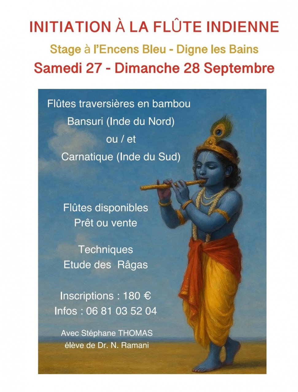 2 dates à retenir pour le mois de Septembre 2025 (un concert le 14 sept à Forcalquier et un stage initiation à la flûte indienne à Digne les Bains les 27 et 28 septembre avec Stéphane THOMAS)