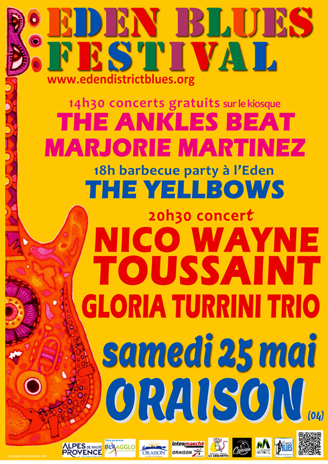 La huitième édition d'Eden Blues Festival se déroulera samedi 25 mai à Oraison. Sur la place du kiosque, deux concerts gratuits à partir de 14h30, avec le duo The Ankle Beats suivi du quartet de Marjorie Martinez, puis devant l'Eden à 18h, la BBQ Party, avec le concert des Yellbows. Enfin, à l'Eden à 20h30, les deux concerts du soir avec Gloria Turrini trio et Nico Wayne Toussaint, pour lesquels l'entrée est à 20€, tarifs réduits 13€ et 16€, entrée gratuite pour les moins de 18 ans.