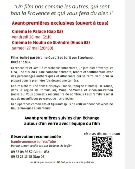 Les 26 et 27 mai prochains, deux avant-premières du film « Elle est pas belle la vie ? » auront lieu dans les cinémas le Palace à Gap et le Moulin Saint-André à Vinon-sur-Verdon. Ces projections, ouvertes à tous, seront suivies d’un débat avec l’équipe du film. En raison d’un nombre de places limité, les réservations sont recommandées.