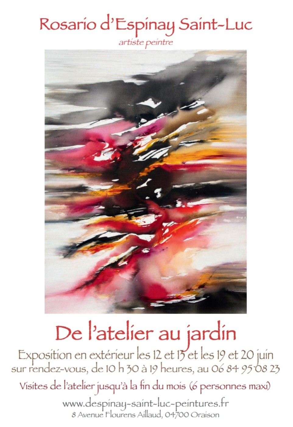 "De l'atelier au jardin", une exposition en plein air organisée par l'artiste peintre Rosario d'Espinay Saint-Luc à Oraison, dans son atelier, le week-end du 19 et 20 juin de 10h30 à 19h00. Visites sur Rdv au 0684950823.