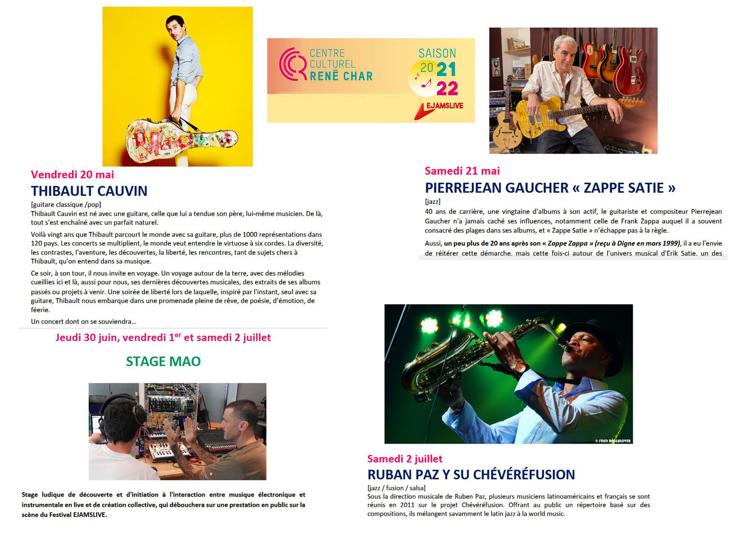 Du 30 juin au 2 juillet Ej@mslive propose un stage de musique assistée par ordinateur MAO avec une master class qui s’adresse aux musiciens et, cerise sur le gâteau, ils produiront une composition originale qui sera jouée en ouverture du dernier concert du festival exceptionnellement sur la place du Général de Gaulle, le 2 juillet avec Ruban paz y su Chévéréfusion. Un concert gratuit pour clôturer le festival mais aussi pour ouvrir la saison estivale culturelle. Evénement privilégié autour de la guitare et de sa pratique, Ej@mslive permet d'aborder la musique d'une autre manière.
