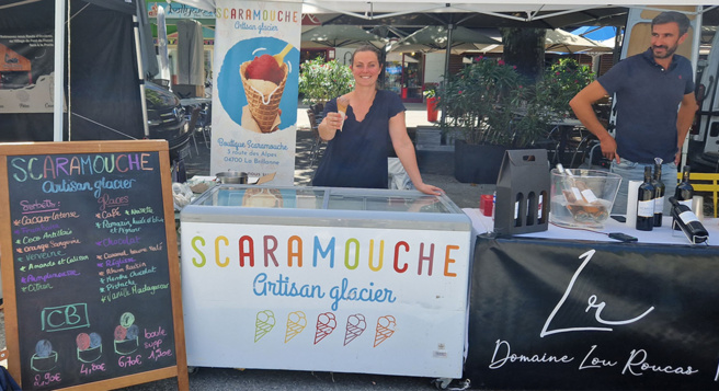 Présents sur la Fête du Terroir 24ème édition à Digne les bains, Guillaume présente tout d'abord son stand de vin Bio labellisé AB, puis Claire enchaine avec les glaces au miel thym, vanille, chocolat, caramel... de Scaramouche. De quoi vous mettre l'eau à la bouche. Reportage Odile Frison.