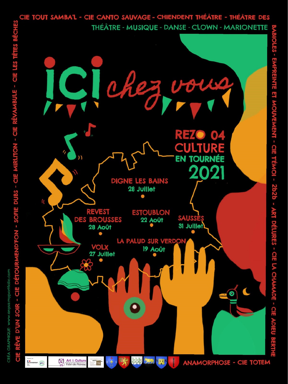Le Chiendent Théâtre, Cie 2b2b, Cie Adieu Berthe, Cie les Arts Délurés, Anamorphose, Le Théâtre des Babioles, La Boite à Ressort, La Chamade, Canto sauvage, Sofie Dubs, Empreinte en mouvement, Cie T'Emoi, Cie du Mirliton, , Rêve d'un soir, Cie Rêvambule, Les Têtes bêches, Cie Totem, Tout Samba'l, Détourmend'fon