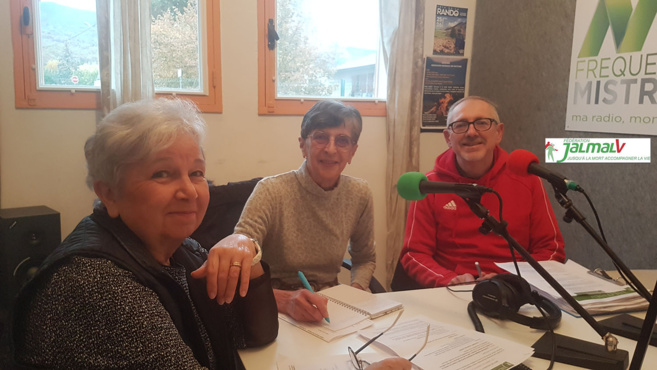 Au micro d'Odile Frison, Annie Pégolotti Présidente de JALMALV 04, Claude Ranchon vice-Présidente et Pierre Sommereijns membre du conseil d'administration et bénévole.