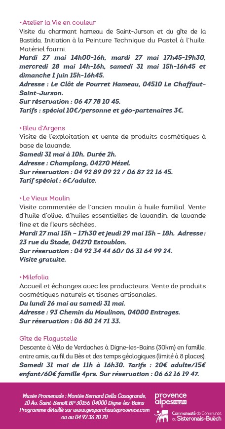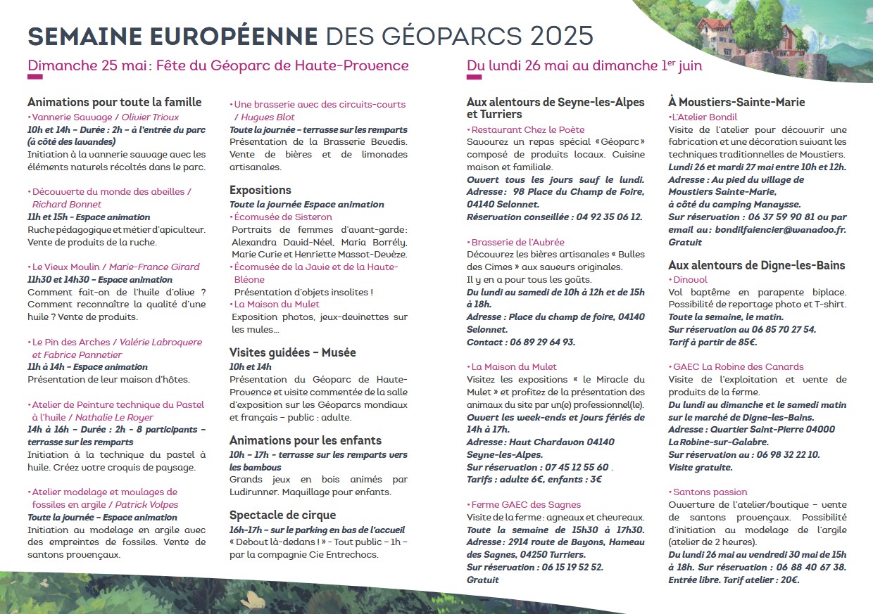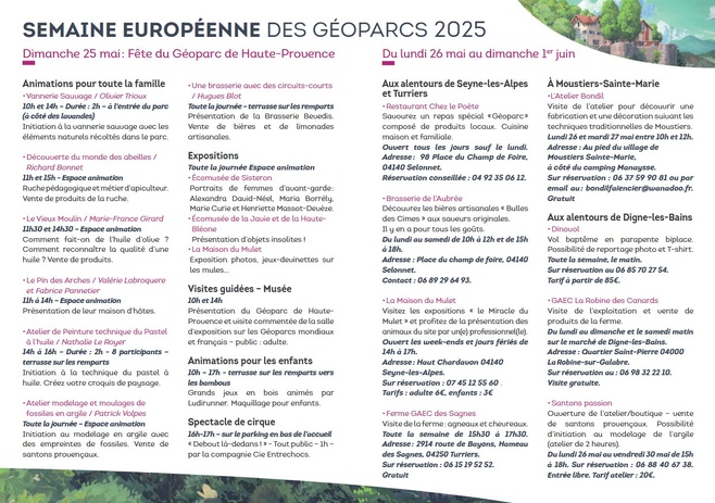 Cet événement gratuit et ouvert à tout public, sans inscription, se déroulera au Musée Promenade dimanche 25 mai de 10h à 17h : il sera le coup d'envoi d'une semaine consacrée à l'exploration du patrimoine naturel, culturel et humain du Géoparc mondial UNESCO de Haute Provence.