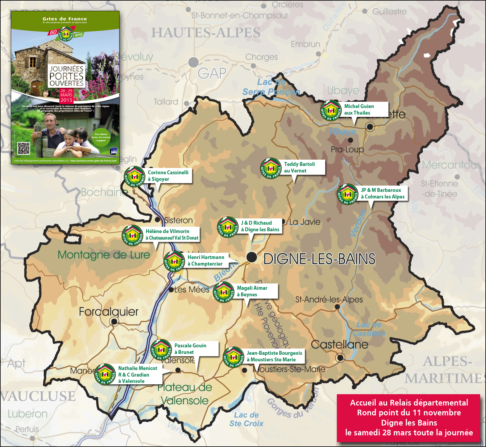L’histoire de ce label et beau dispositif commence dans le 04. A l’époque on disait les Basses Alpes, dont le Sénateur Emile Aubert eut une vision prometteuse juste après la guerre dans un pays à reconstruire. Ouvrir les campagnes à l’hébergement de citadins à l’heure où la sécurité sociale, les salaires minimums ou le droit aux vacances pour tous allaient marquer la France. Et c’est à La Javie chez Lucien et Denise Roche que le 1° gîte est ouvert en 1951. Deux ans plus tard un deuxième gîte s’ouvre dans les Hautes-Alpes puis en 1955, la charte des paysans-logeurs et la création de la fédération naturellement présidée par Emile Aubert tout cela assure le lancement du mouvement. Le partage des ressources des agriculteurs leur apporte un revenu complémentaire et les visiteurs découvrent au plus près le monde rural, le principe a rapidement connu le succès ; il est copié dans plusieurs pays. Aujourd’hui la Fédération des Gîtes de France est un acteur majeur du tourisme. Loin des mouvements de masse ou des charters et autres croisières, c’est un tourisme chaleureux, généreux et en phase avec les territoires que mettent en avant les gîtes ruraux notamment. Avec des déclinaisons adaptées : gîtes de neige, panda, chambres et tables d’hôtes, gîtes d’étapes etc. Et ils savent évoluer, le bien être de la campagne mais avec le wifi par exemple pour ceux qui le souhaitent. Ce week-end dans le 04, près d’une trentaine de gîtes divers ouvrent leurs portes au public avant un temps fort en juin le congrès national des Gîtes de France qui a lieu à Gréoux-les-Bains, nous aurons l’occasion d’en parler. Pour l’instant, je vous propose d’écouter les Président et Directeur départementaux des Gîtes de France Auguste Derrives et Thierry Hours. Ils répondent aux questions de François Malabave.