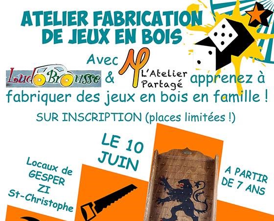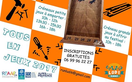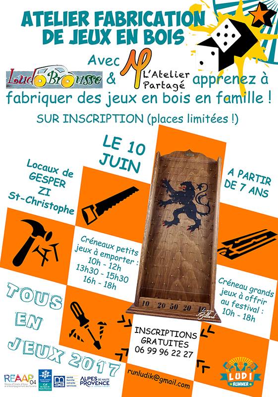 Pour plus d’info : Cette année c’est « Tous en Jeux à Digne », et le samedi 10 juin c’est la Fabrik Ludik où vous pourrez apprendre en famille à réaliser de fantastiques jeux en bois. Les bricoleurs de l’Atelier Partagé et de la Ludobrousse vous accompagneront à chaque étape, en toute sécurité et à votre rythme, pour fabriquer des jeux qui vous ressemblent !