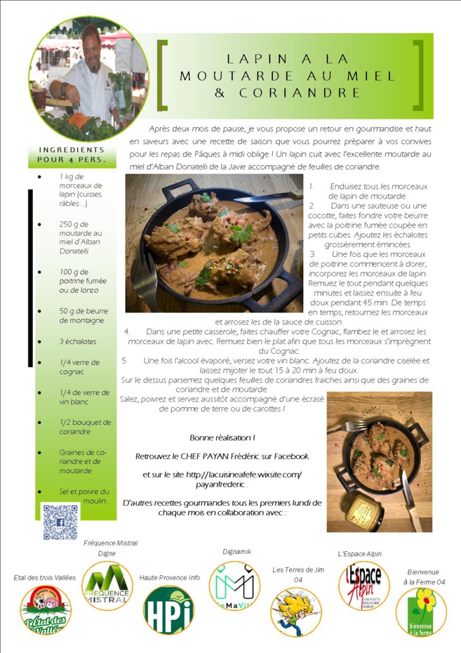 Généralement, tous les mois (premier lundi du mois) , retrouvez une recette diffusée sur Fréquence Mistral Digne dans la matinale à partir de 9h15, sur le quotidien et internet Haute-Provence Info et dans votre magasin ETAL DES 3 Vallees et Dignamik sous forme de fiches recettes.