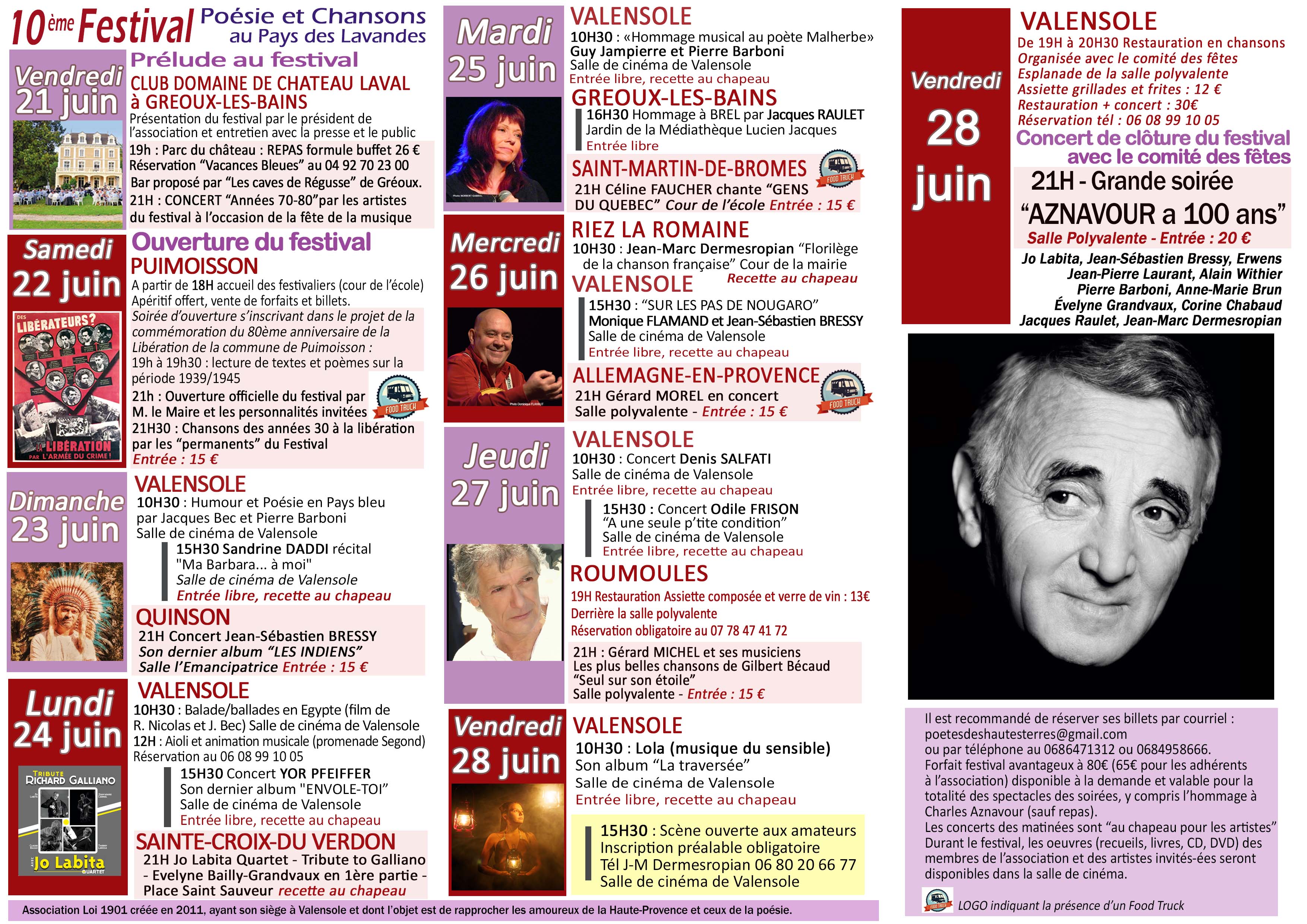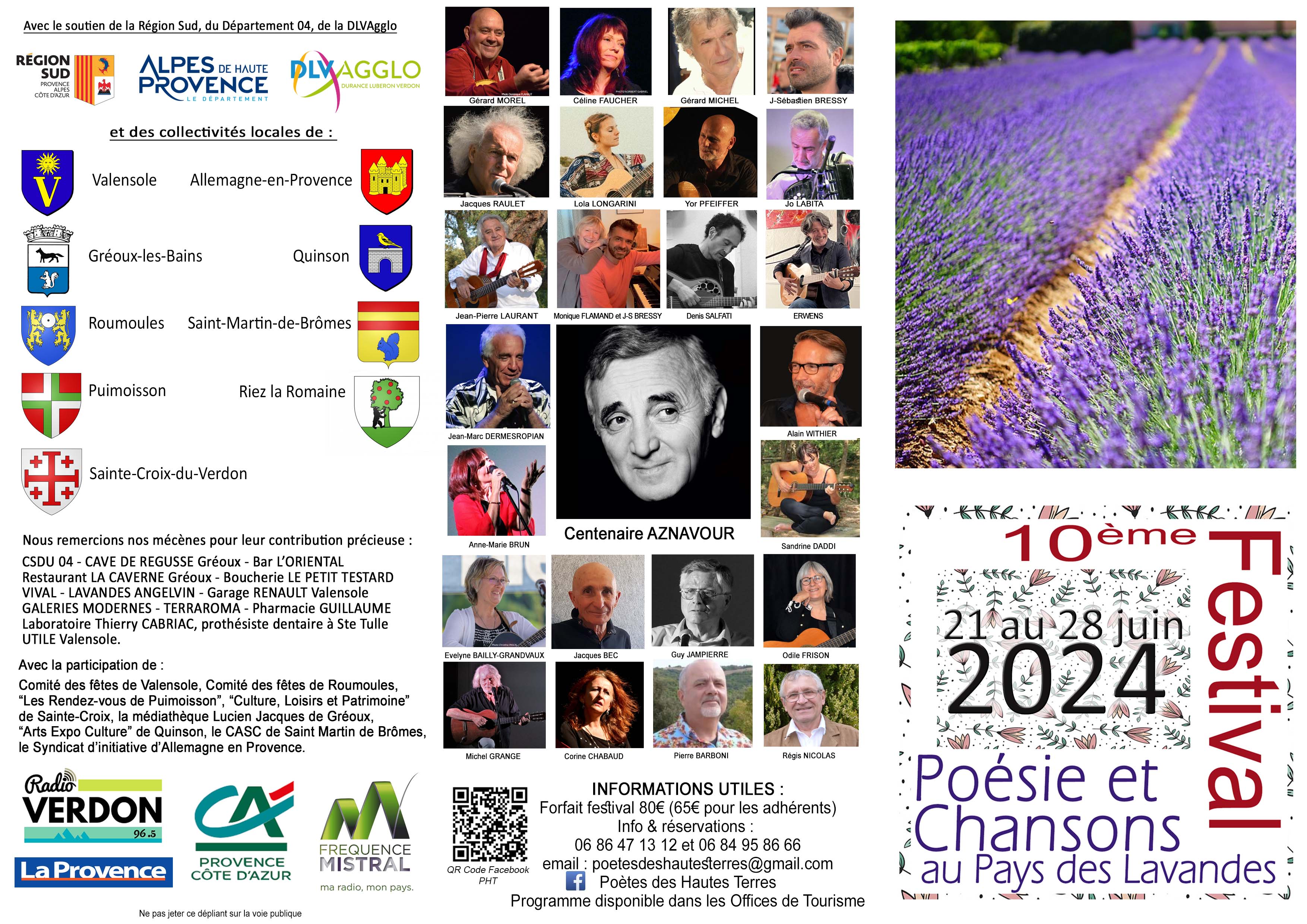 Comme chaque année, Fréquence Mistral est partenaire du Festival Poésie et chansons au Pays des Lavandes. Jacques Bec accompagné de Régis Nicolas nous présente en détail le programme de cette saison. Au total, pour cette 10ème édition, ce sont 24 artistes, 8 jours de Festival, sur 9 communes du plateau de Valensole.