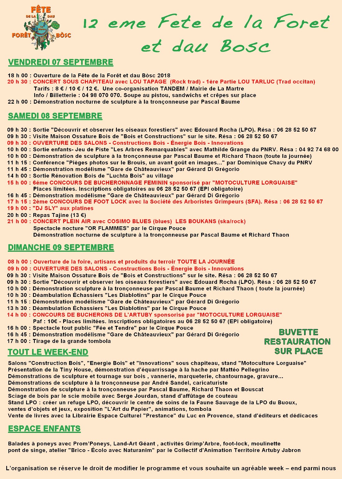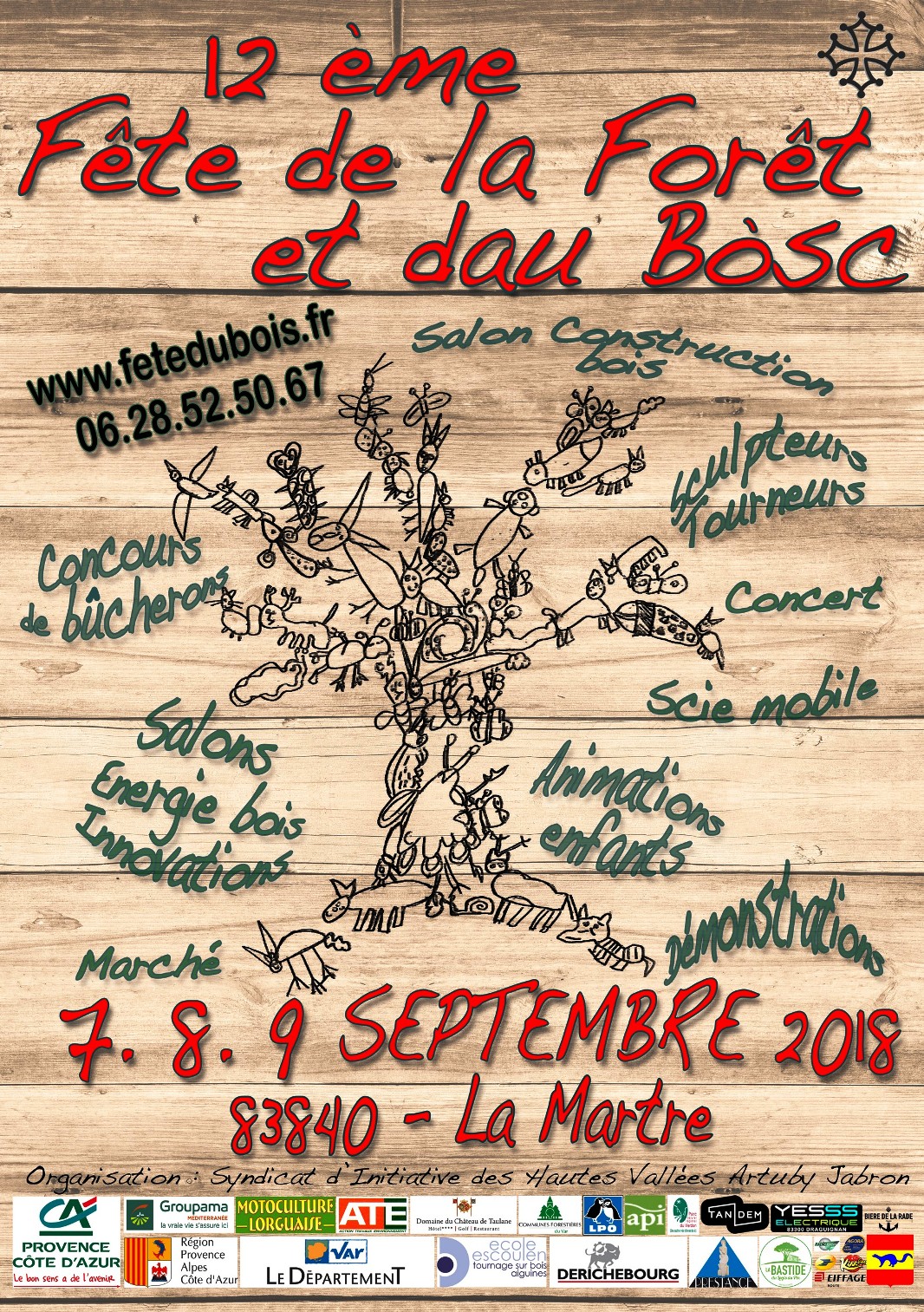 Le Syndicat d’Initiative des Hautes Vallées de l’Artuby et du Jabron et la commune de La Martre organisent du 7 au 9 septembre la 12ème édition de la Fête de la Forêt et du Bois. Cette manifestation, à l’ampleur grandissante, propose un programme varié autour de son thème et dans le respect de l’environnement : nombreuses expositions et démonstrations de professionnels, des concours, concerts de musiques dansantes sous chapiteau, sorties et conférences thématiques, également des salons, des ateliers et spectacles pour jeune public avec un espace spécialement dédié aux enfants, des démonstrations et animations en tout genre, et enfin une grande foire et un marché le dimanche. La commune varoise de la Martre est située au cœur du Parc Naturel Régional du Verdon, au croisement des départements 04, 06 et 83. Pour plus d’informations, notamment le programme complet de cette édition, sur le net : www.fetedubois.fr ou la page Facebook Fête de la forêt et du bois, ou encore par téléphone au 06 28 52 50 67.