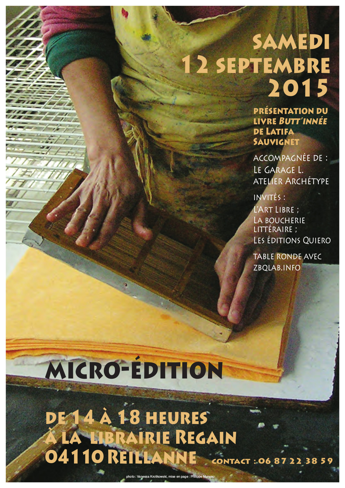 Samedi 12 septembre Latifa Sauvignet présente son livre " Butt'inée ", un ouvrage original, entièrement fait main et proposé en édition limitée. Ce livre singulier a été réalisé en partenariat avec Le Garage Laurent et l'Atelier Archétype de Forcalquier. De nombreux invités lors de cet évènement autour d'une table ronde sur un secteur encore méconnu : La Micro Edition. Dans le reportage de Nathalie Bagarry vous entendrez Latifa Sauvignet et Sadou Czapka de la Librairie Regain.