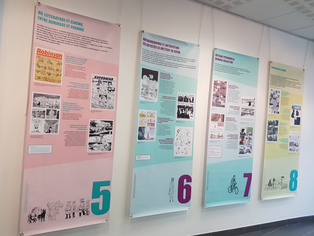 Plusieurs thématiques sont illustrées en 15 panneaux reproduisant des planches et d'autres proposant des agrandissements d’œuvres propices à l’étude du langage et des techniques de la bande dessinée.Parmi les thèmes abordés : les écoles américaines, des premiers illustrés à la révolution Pilote, la fin des Trente Glorieuses ou encore littérature et cinéma. On y croise ainsi des artistes divers et talentueux : Morris, Goscinny, Hugo Pratt et son mystérieux Corto Maltese, Gotlib, José Muñoz, le regretté Cabu, Reiser, Enki Bilal, Farid Boudjellal, Jerry Siegel et d’autres encore. Tous réveillent nos consciences et nous aident à mieux comprendre le monde.