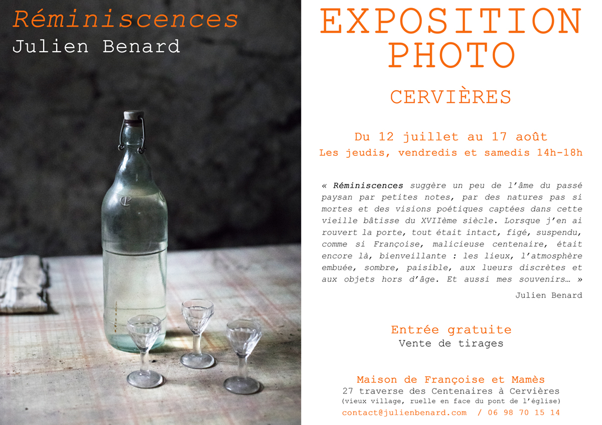 L'exposition Réminiscence de Julien est ouverte de mi juillet à mi août les jeudis, vendredis et samedis de 14h à 18h.