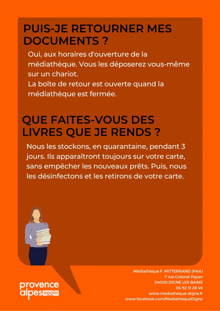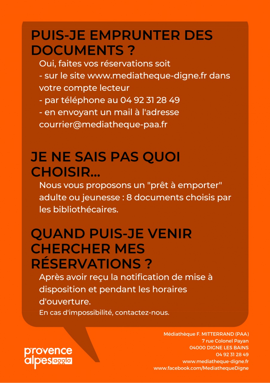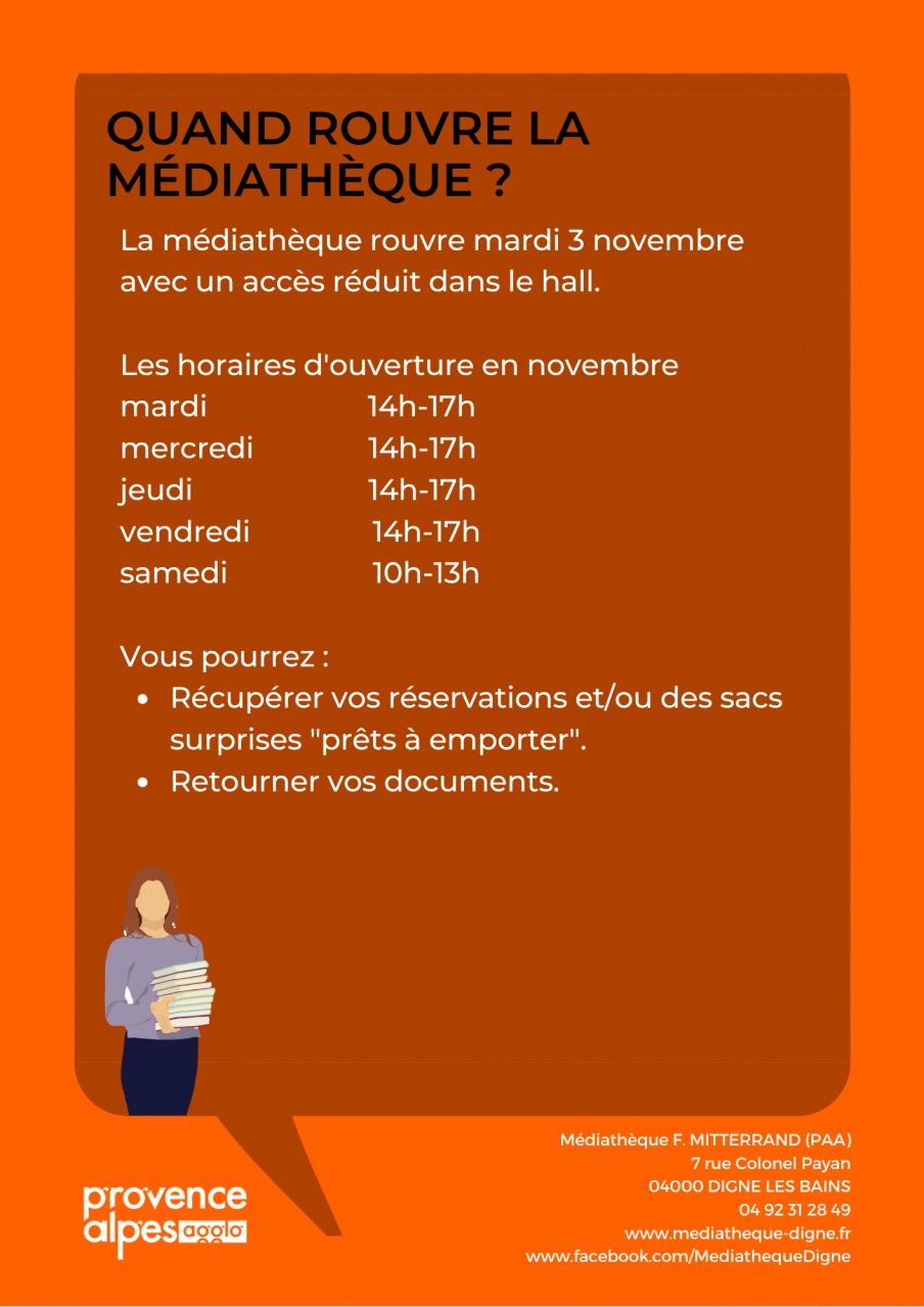 du mardi au vendredi de 14h à 17h, et le samedi matin de 9h à 13h la médiathèque accueillera le public dans le hall par groupe de 3 ou 4 personnes.