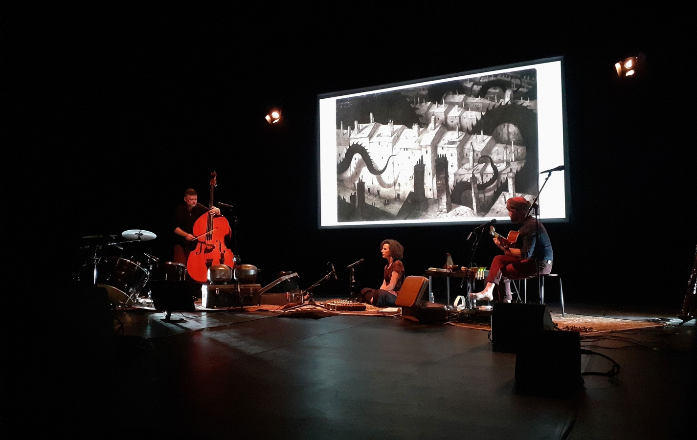 C’est l’histoire d’un homme qui fait sa valise, quitte sa famille et son pays pour débarquer sur une terre inconnue, de l’autre côté de l’océan. C’est l’histoire d’une migration et de ses enjeux émotionnels et culturels : perdre ses repères, être séparé des gens que l’on aime, ne plus rien comprendre à ce qui nous entoure mais aussi construire de nouvelles amitiés et faire de joyeuses découvertes. Là où vont nos pères est à l’origine une bande dessinée dépourvue de texte, signée Shaun Tan, primée meilleur album en 2008 au Festival d’Angoulême. Tombés amoureux de cette oeuvre résolument poétique, les trois musiciens de LOVLA ont créé un bd-concert dans lequel la projection des vignettes aux délicates teintes sépias s’accompagne d’un voyage musical où s’entremêlent compositions et improvisation. À la voix, à la contrebasse, à la guitare et au basson, s’ajoutent une multitude d’autres instruments pour créer un folklore imaginaire aux sonorités dépaysantes.