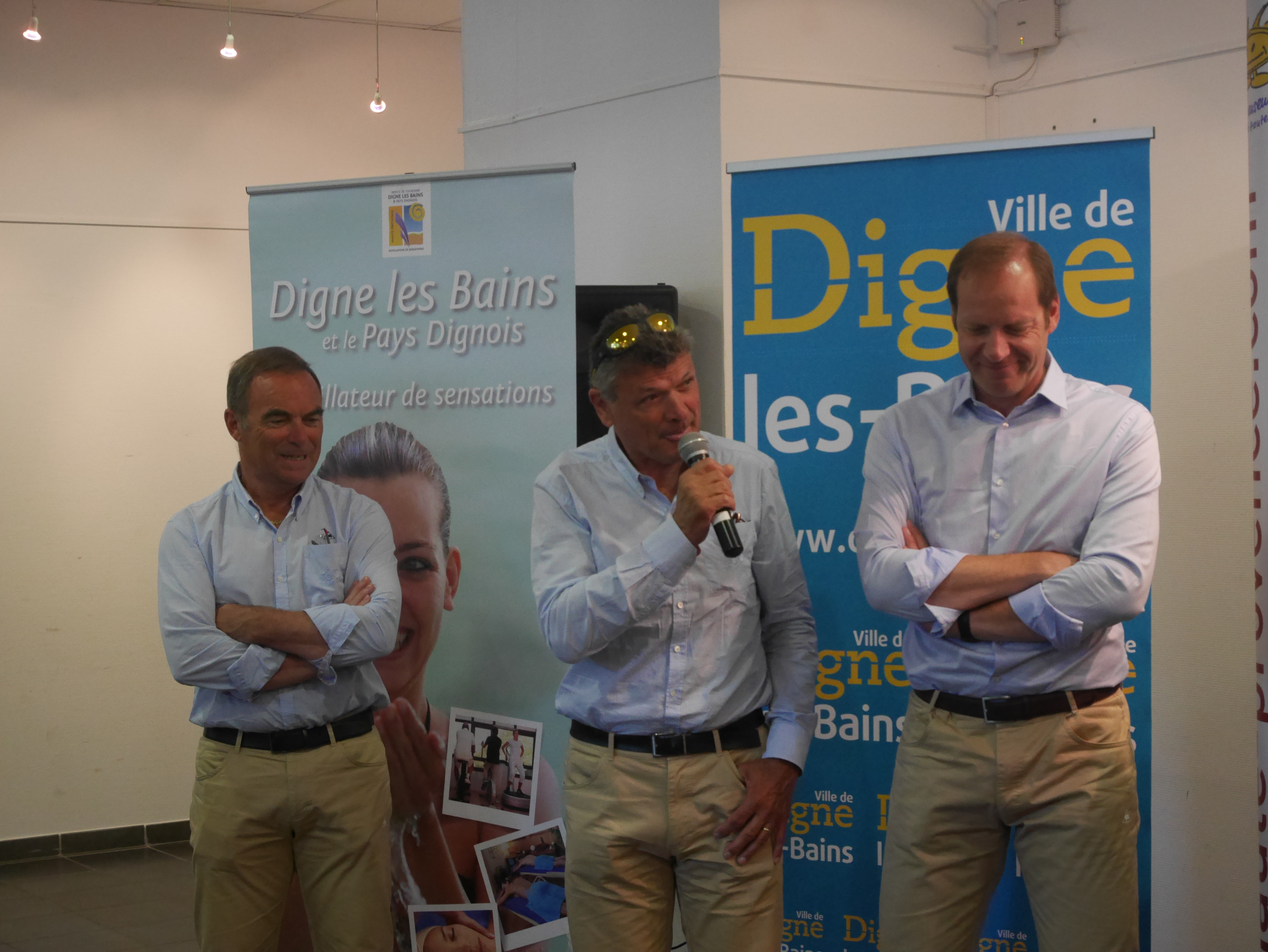 Depuis quelques années ils ont raccroché leurs maillots, Bernard Thévenet dirige le Critérium du Dauphiné et Bernard Hinault est chargé des relations publiques au sein d’Amaury Sport Organisation. Ils étaient dans la cité préfectorale pour promouvoir ce sport très populaire. Digne-les-Bains-Pra-loup Bernard Thévenet connait très bien car c’est là-haut qu’il y a 40 ans il détrônait Eddy Merckx dit « Le cannibale ». Je vous propose d’écouter Patricia Granet ravie d’accueillir cette étape dans sa ville puis nos 2 Bernard ; ils répondent aux questions de Jean-Marc Léca.