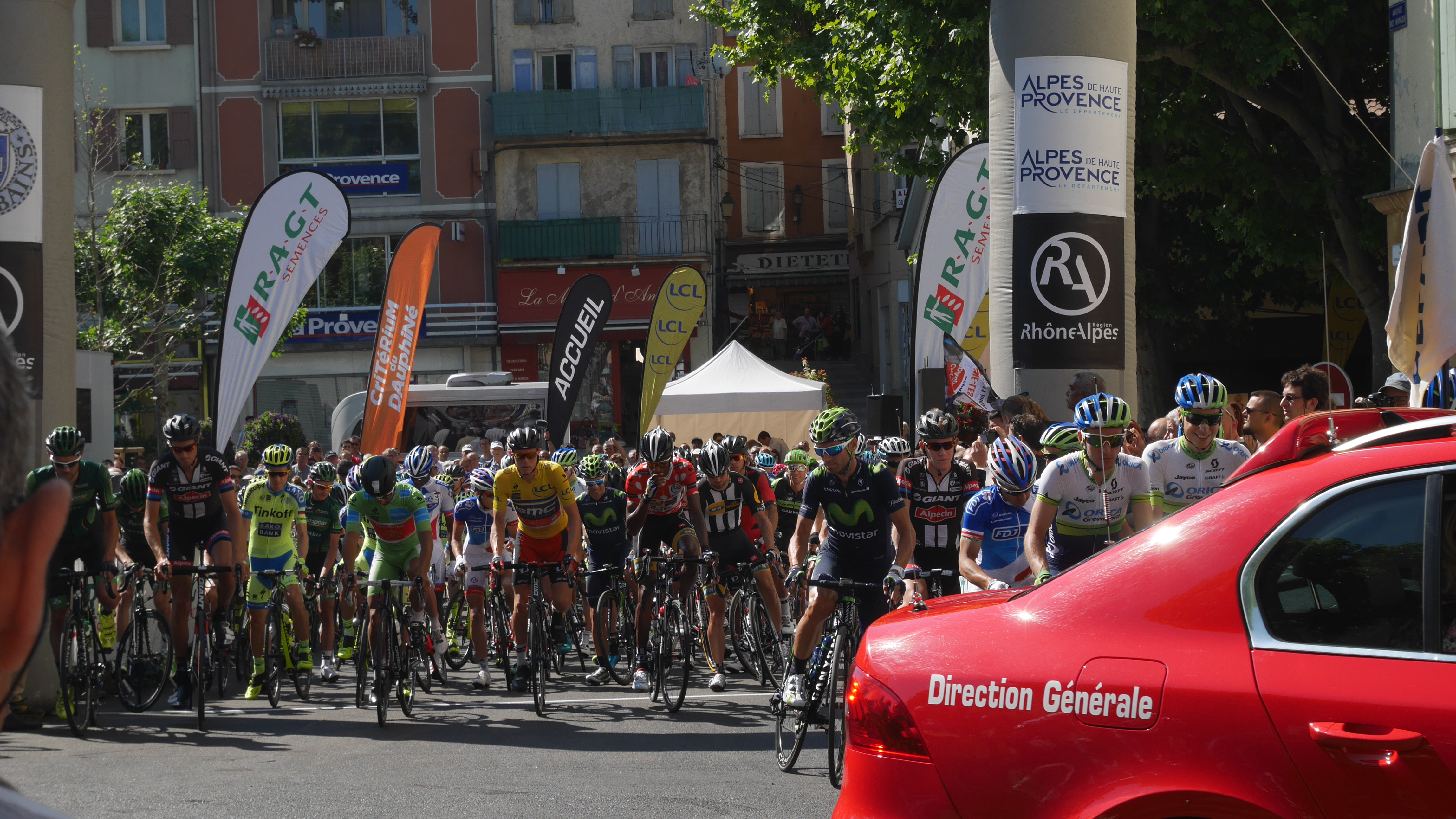 Prélude à la 17ème étape du 22 juillet prochain pour le Tour de France, qui mena Bernard Thévenet en jaune jusqu’aux Champs Elysées il y a 40 ans, la 5ème étape du Critérium du Dauphiné avait Digne-les-Bains comme ville hôte. Après Sisteron la veille et Pra-loup l’après-midi avec un formidable Romain Bardet, les Alpes de Haute Provence avaient un parfum jaune citron ce 11 juin. Les162 coureurs de cette 77ème édition du Critérium Dauphiné avaient pris place sous un superbe soleil Boulevard Gassendi sous les yeux des nombreux amateurs de cyclisme et autres badauds venus là pour célébrer un sport haut en couleurs et bien connu de nos contrées alpestres. En jaune depuis quelques jours Rohan Dennis portait encore sur ses épaules l’étiquette de favori mais jusqu’à quand ? … Et que dire de Nacer Bouhanni le sprinter de vert vêtu qui espérait conserver son maillot le plus longtemps possible ?