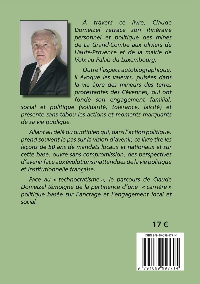 Avec l’aide de son épouse Paulette et de Jean-Yves Arnaud qui a accompagné Claude Domeizel avec constance, c’est François Malabave journaliste à Fréquence Mistral qui a conduit et rédigé les entretiens de ce livre. Au final le témoignage vivant d’un élu engagé localement et socialement.