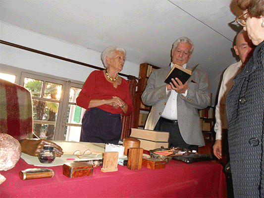 Fervent lecteur de Jean Giono, Mario Vargas-Llosa, Prix Nobel de Littérature 2010 a effectué une visite au Centre Giono et au Paraïs, maison de l’auteur de Colline. En compagnie de Sylvie Giono, fille de l’écrivain et de Jacques Mény, Président de l’association des Amis de Jean Giono, le grand homme de lettres péruvien a savouré sa visite manosquine. Une plongée dans l’antre de la création d’un auteur qu’il admire. Impressionné par la bibliothèque il aura été surpris et honoré d’y voir deux de ses ouvrages que l’hôte du Paraïs a certainement lus. Intrigué aussi de la variété des écrivains, éditions et ouvrages que contient la bibliothèque du voyageur immobile de Manosque. Et bien sûr le Nobel péruvien a ressenti une grande émotion dans le bureau conservé en l’état depuis la mort de Giono où tant et tant de pages et de chefs d’œuvre ont été écrits. Mais c’est en feuilletant le manuscrit du « Hussard sur le toit » que le Mario Vargas-Llosa a eu sa plus belle sensation. Création intime avec peu de ratures, et étalée sur trois années avec les commentaires de Sylvie : « Chaque soir mon père nous lisait un passage de son travail du jour et j’étais amoureuse d’Angelo, je guettais ses aventures avec curiosité et anxiété ». Œuvre romanesque majeure du 20° siècle, le hussard glissait sous les mains du Nobel échappant encore et toujours au choléra et aux Manosquins. Je vous propose d’écouter ce grand écrivain qui a fait le voyage à Manosque éclairant de sa simplicité, son étonnement et sa profondeur un merveilleux Paraïs et vice-versa…