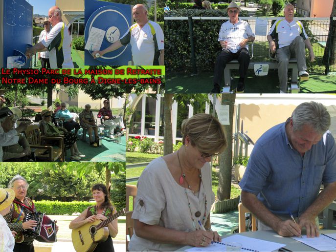 En promouvant le physio parc de la maison de retraite de Notre Dame du Bourg, le centre communal d’action sociale dignois encourage l’activité physique. Adapté aux personnes âgées et sécurisé, cet espace est équipé de matériels sportifs pour réaliser différents exercices de mobilité et d’assouplissement du corps sur un petit parcours. Une convention entre le CCAS et l’établissement permet d’en faire profiter les personnes extérieures à la maison de retraite. Cet équipement est installé depuis 2012 et il est spécifiquement adapté pour les personnes en perte d’autonomie ; le physio parc est financé par l’Agence Régionale de Santé. L’objectif est d’ouvrir Notre Dame du Bourg et de faire bénéficier des avantages du physio parc à un plus large public. Une ambiance conviviale et festive avec la musique de Mylène et Miguelito, et une dégustation de savoureuses pâtisseries, et jus de fruits a régné lors de la signature de cette convention. Je vous propose d’écouter le témoignage de Michel, 81 ans accompagné de son épouse Marguerite-Marie, tous deux venus d’Aiglun pour tester de manière festive le physio parc. Mais tout d’abord une brève démonstration sur le terrain avec un habitué âgé de 75 ans, puis vous entendrez Marie-Laure Kergadalan Directrice du Centre Communal d’Actions sociales de la ville de Digne-les-Bains, son collègue Jean-Philippe Lenfant. Reportage Odile Frison.