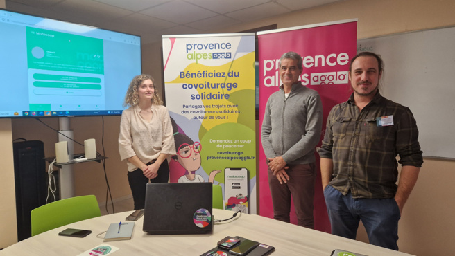 Au micro d'Odile Frison, Georges Pereira Vice-président à Provence Alpes Agglomération, délégué à la mobilité et aux politiques de la ville de Digne les Bains, Jean-Sébastien Lopez animateur de transition à Mobicoop et Orane Beau, chargée de mission mobilité durable à PAA.