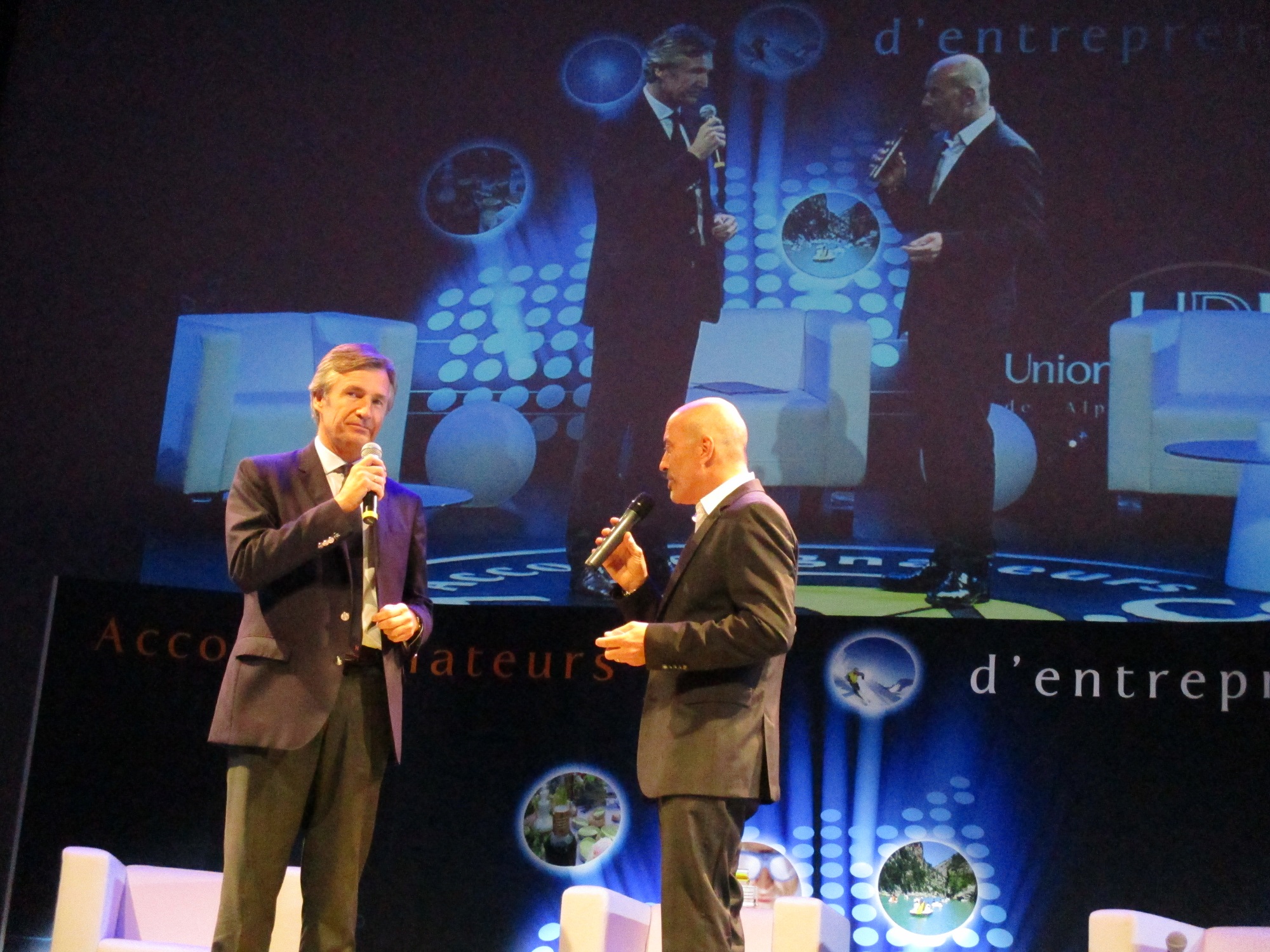 Ainsi Nicolas Beytout que nous entendrons dans un instant mais aussi Emmanuel Toniutti, surprenant coach de dirigeants, docteur en théologie et qui a mis une pincée de philosophie dans l’événement. Il cite d’ailleurs les préceptes d’Adam Smith, économiste écossais du 18° siècle : courage, sympathie et solidarité. Trois valeurs essentielles dans une entreprise, mais également dans une cellule familiale, une équipe de rugby, un orchestre symphonique, etc. Une leçon de vie en plus de l’économie. La propension de la France à voir le verre à moitié vide plutôt qu’à moitié plein, à se plaindre de tout et rien en même temps, à laisser nos propres valeurs – Liberté Egalité Fraternité – s’embourber dans une actualité dramatique, tout cela fut passé au filtre de Toniutti qui cultivant l’outrecuidance, en plus, ose se présenter aux élections présidentielles de 2017 ! Une intervention détonante et percutante que le public de patrons et partenaires de l’entreprise a appréciée.