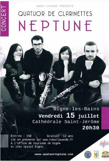Venus de Corée, du Japon, du Chili mais aussi de France les musiciens du Quatuor Neptune se produisent ce vendredi 15 juillet à la Cathédrale Saint Jérôme. L’un des leurs, Vincent ancien pensionnaire du Conservatoire à Digne revient dans la cité préfectorale où il a fait ses premières gammes. Avec lui, Sooyeon, Yumi et Alvaro nous emmènent en Europe et ils nous font également visiter la quasi-totalité des continents. La particularité de cet ensemble de clarinettes réside dans le fait que les instruments utilisés ne sont pas tous en si bémol telles que nous les connaissons et la clarinette basse par exemple sera également jouée dans la cathédrale Saint Jérôme. Alvaro qui l’utilise a eu quelques difficultés à dompter cette clarinette du fait de sa longueur peu commune. Ce quatuor prend plaisir à jouer ensemble et tous vous donnent rendez-vous ce soir à Digne-les-Bains Cathédrale Saint Jérôme pour les écouter religieusement. Pour ce Quatuor Neptune, je vous propose d’écouter Vincent Martin-Charpenel puis Alvaro Zegers ; ils répondent aux questions de Jean-Marc Léca.
