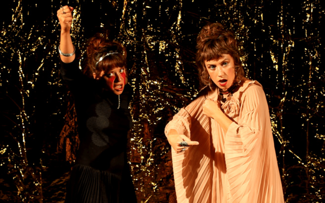 À bout portant du public attablé, deux comédiennes en tenue de soirée racontent en une vingtaine de récits les histoires d’amours contrariés, les batailles perdues qui ont fait naître les animaux, les montagnes, les fleuves qui nous entourent. Tout y est transformation, aucune identité n’est éternelle : échapper aux dieux en devenant un arbre, aux humains en devenant un chien, traverser des forêts qui étaient des nymphes… Ovide semble nous inviter à nous réinventer sans cesse.