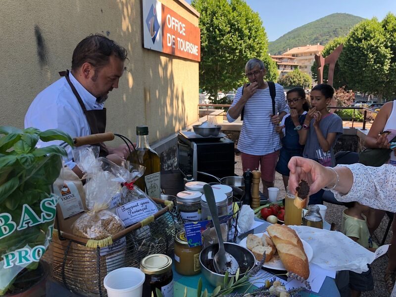 Depuis déjà 3 ans, Christine Mesrouk de l’office de tourisme de Digne les bains et le chef cuisinier Frédéric Payan ont instauré les balades gourmandes sur le marché durant la période estivale. L’objectif est de faire connaître les producteurs locaux, en petit groupe d’une dizaine de personnes. Une visite sur le marché, en achetant les ingrédients nécessaires pour élaborer ensemble quelques recettes apéritives provençales avec le chef Frédéric Payan.