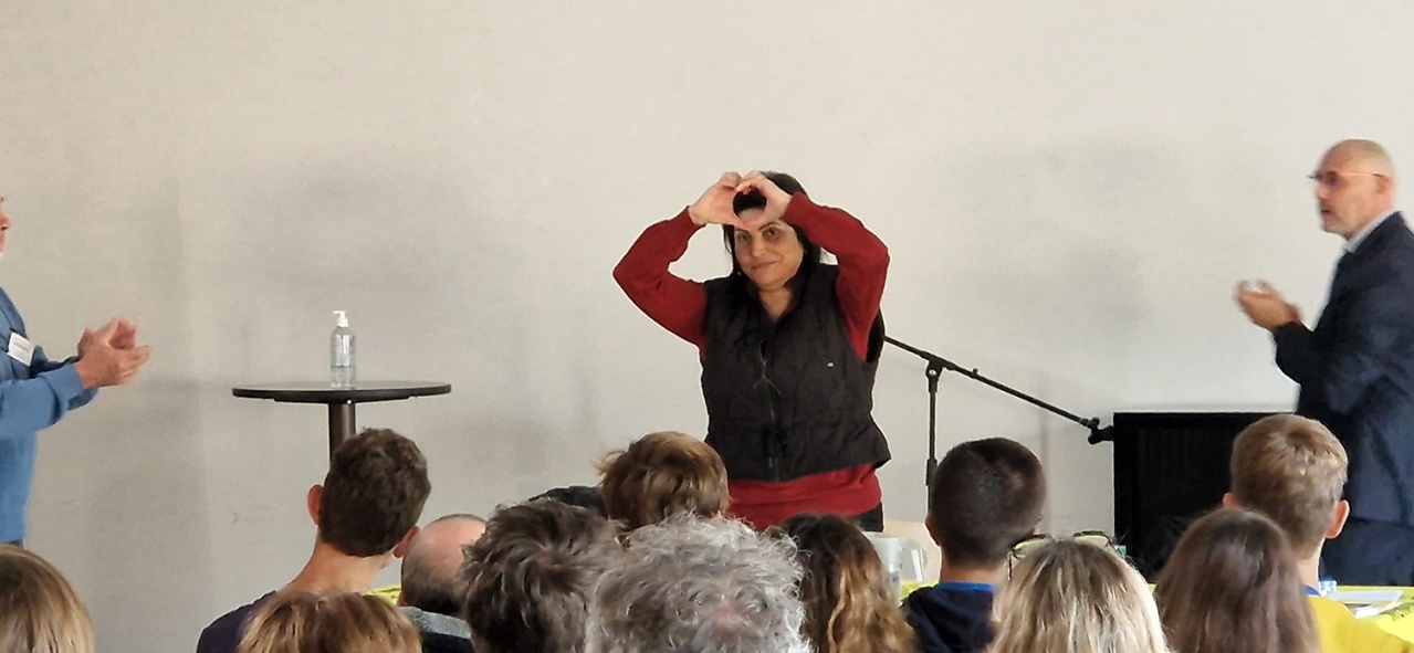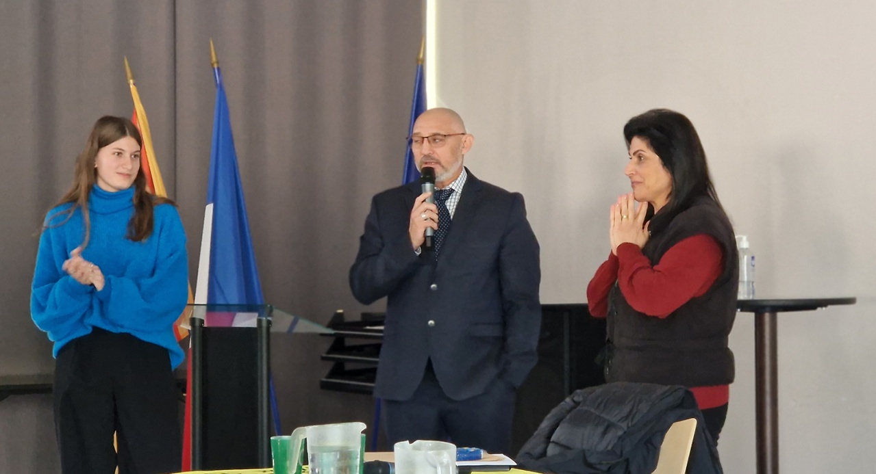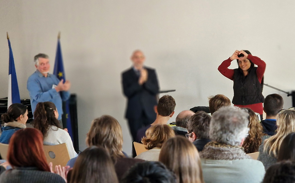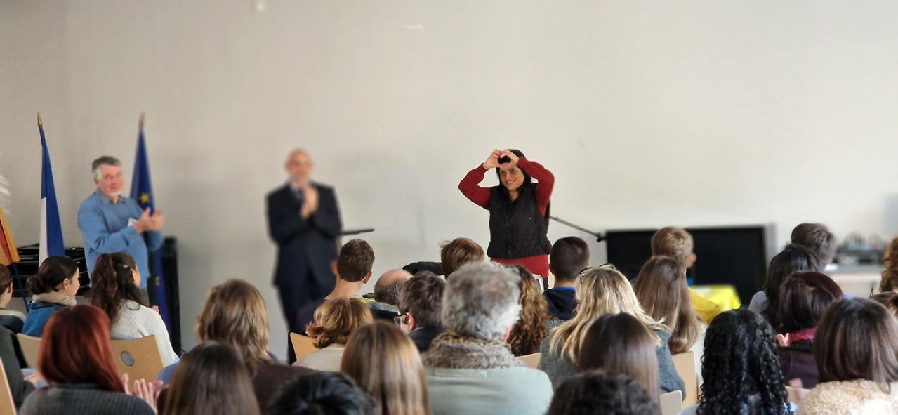Avant d'écouter ce reportage, les applaudissements chaleureux pour cette femme forte, symbole de combat contre les injustices, contre la peine de mort, et la torture, mais aussi, une femme qui ne ressent pas de "haine" contre ses bourreaux, une femme qui continue de se battre pour que subsiste l'espoir, et que l'amour triomphe dans ce monde tellement tourmenté, Antoinette Chahine, (son nom sera donné au patio du lycée, un lieu d'exposition).