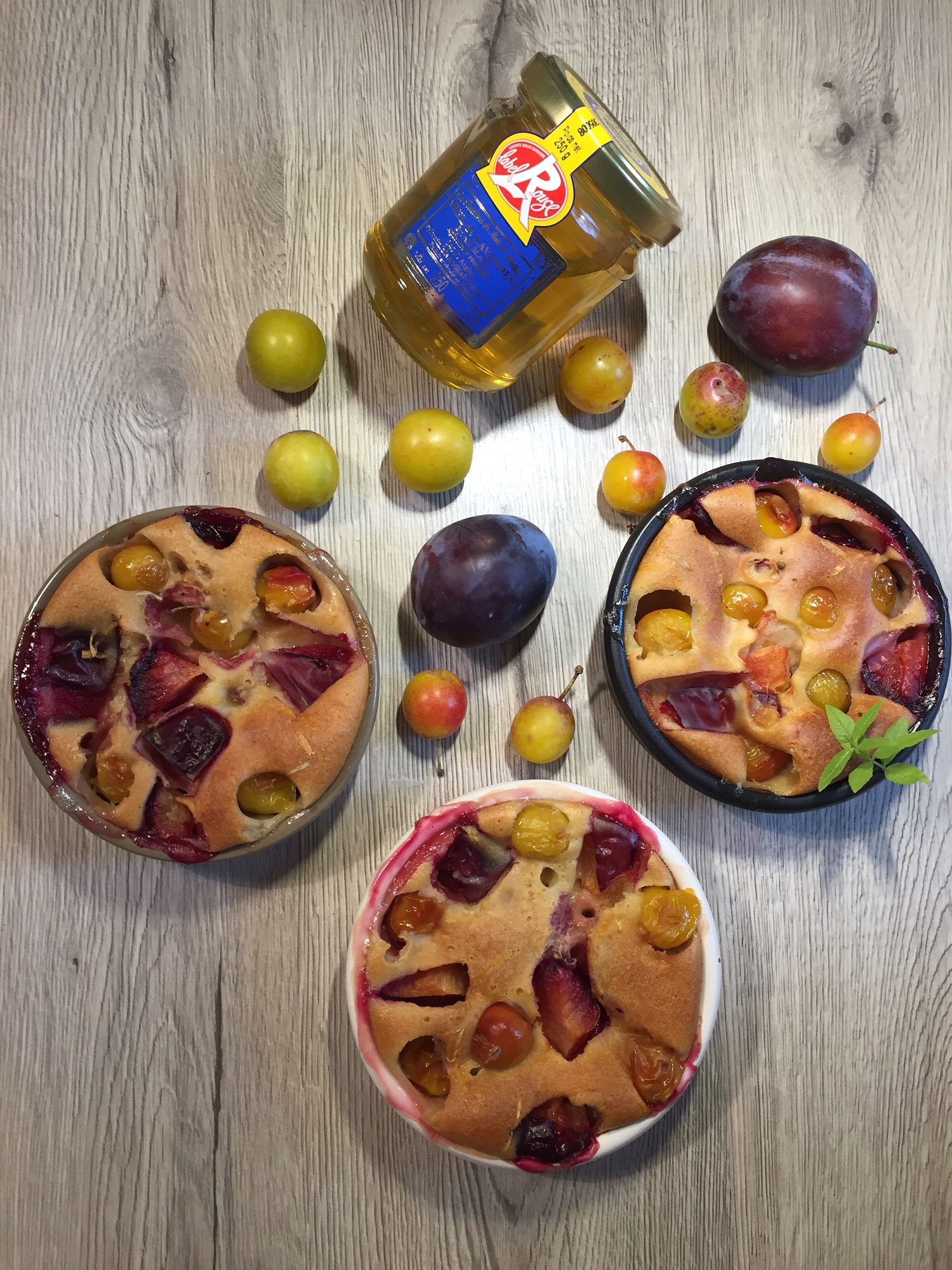 5. Versez le tout sur les mirabelles/prunes rouges et placez les ramequins au four chaud (190°) pour 45-50 minutes. Servir tiède avec une boule de glace.