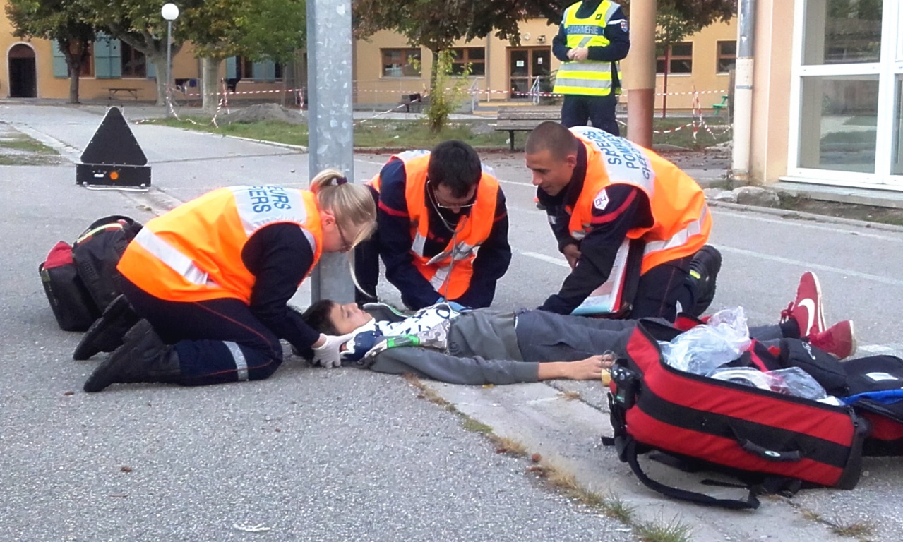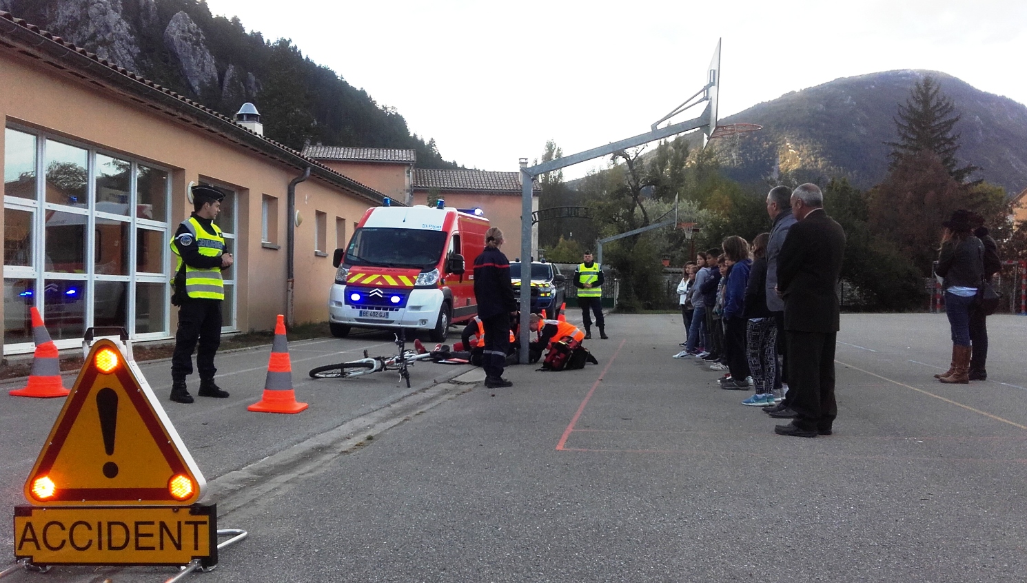 A Castellane, une intervention était consacrée aux risques liés à l’internet, l’autre à la sécurité routière. La présentation des risques sur la toile s’est déroulée en classe mais l’exercice consacré à la sécurité routière consistait en une simulation d’accident et a eu lieu dans la cour de l’établissement. Le scénario impliquait un cycliste (incarné par un élève) victime d’une chute importante, puis l’intervention des sapeurs-pompiers pour les secours proprement dits avec des gendarmes pour la sécurisation des lieux et enfin, l’enquête judiciaire. Cet exercice pratique autour d’un cas concret a retenu toute l’attention des collégiens. Pour information, vous pouvez également retrouver notre reportage du 16 octobre 2017 consacré aux violences scolaires et à la cybercriminalité, réalisé également au collège du Verdon, sur notre site à l’onglet Castellane.